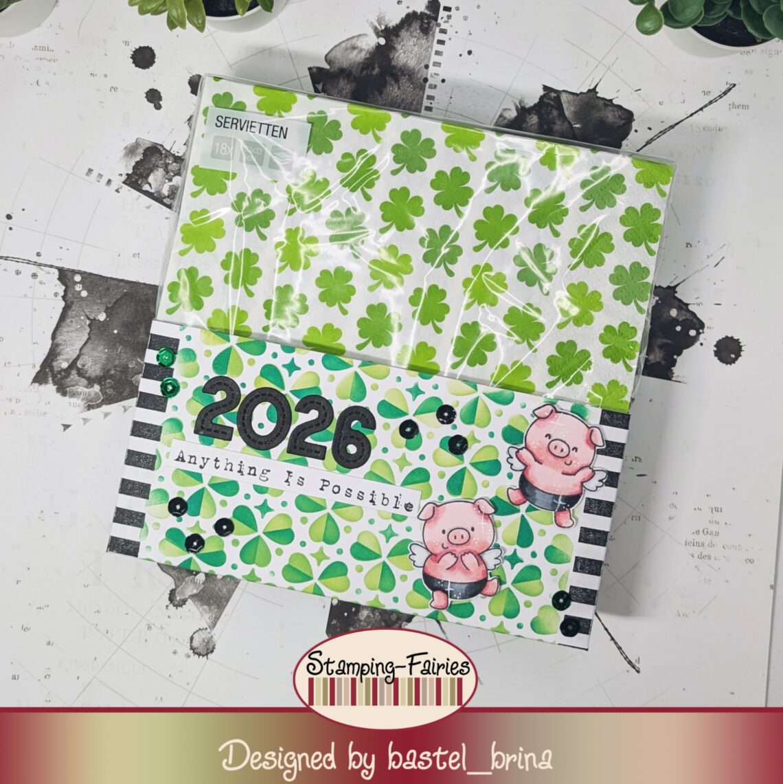 4. Januar 2026Herzlich willkommen zurück! Das neue Jahr ist noch recht jung, daher dachte ich es ist noch die Zeit für ein kleines Mitbringsel im neuen Jahr oder auch für Silvester. Ich habe Servietten gefunden, die mit dem Kleeblattmuster natürlich super zum Thema passen und habe diese noch ein bisschen verpackt. Was habe ich alles genutzt? Aus weißen Cardstock habe ich eine kleine Verpackung gemacht, hier kann man die Servietten hinein schieben. Die Maße habe ich durch das Ausmessen der Servietten bekommen und dann hängt es natürlich davon ab, wieviel von den Servietten raus schauen soll. Nachdem das alles gemessen, gefalzt und…