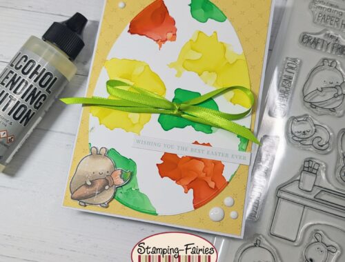 Hallo Ihr Lieben! Heute heiße ich Euch zu meiner letzten Osterkarte – und gleichzeitig auch zu meinem letzten Beitrag für Stamping Fairies – willkommen. Meinem Häschen ist beim Eier bemalen ein kleines Missgeschick passiert, und es hat mit der Farbe…