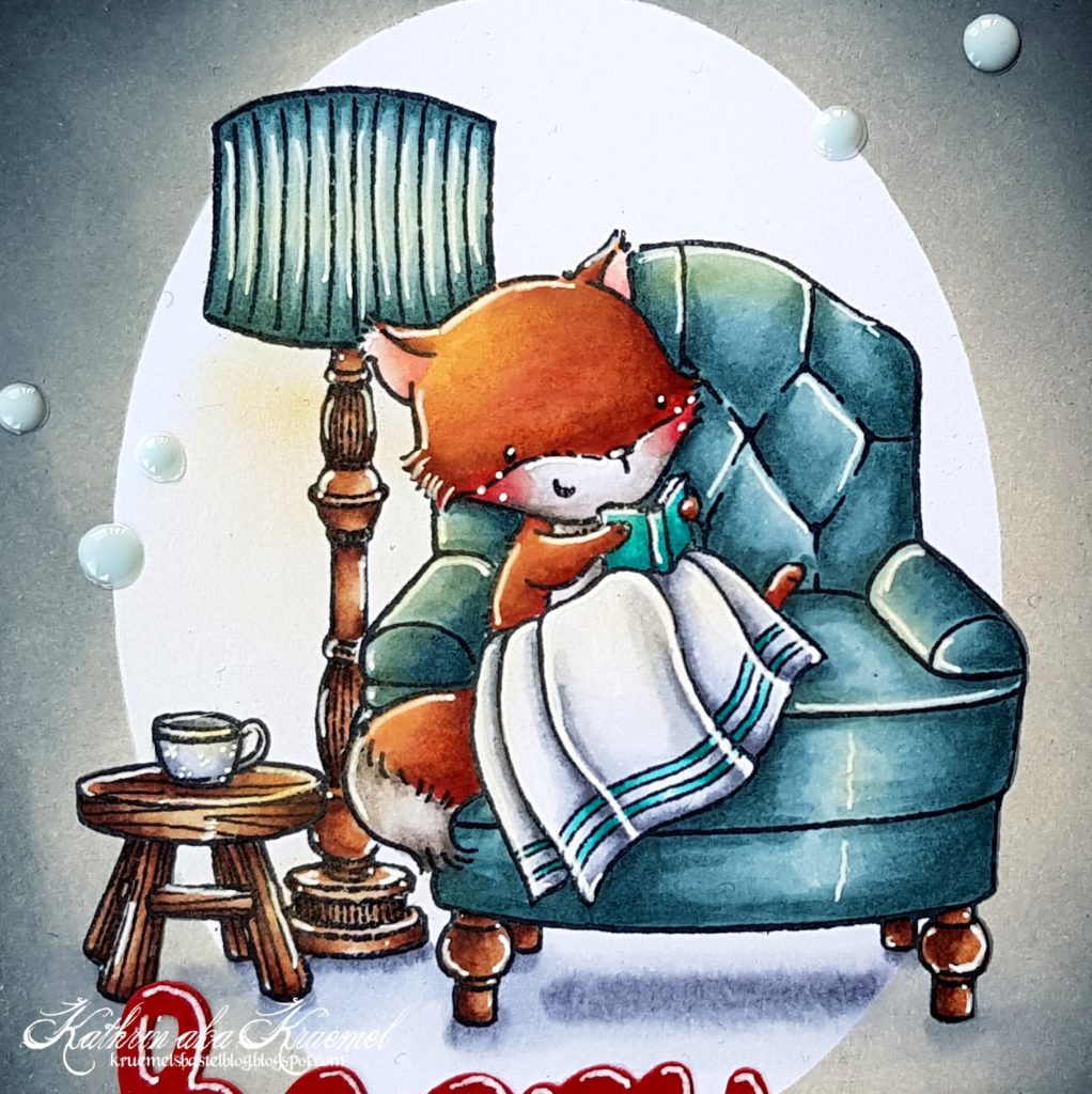 Für das Motiv habe ich verschiedene Stempel aus dem Stempelset Cozy Companions von MFT kombiniert und mit Copics coloriert. Mit gelber Schimmer-Kreide habe ich noch gelbes Licht auf alle entsprechenden Kanten aufgetragen, das ist aber leider auf dem Bild nur an einigen Stellen wie dem Kopf des Fuchses oder der Lehne des Sessels zu erkennen.
