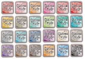 Mit verschiedenen Distress Oxides habe ich darauf gewischt und dann mit reichlich Wassertröpfchen bespritzt.
