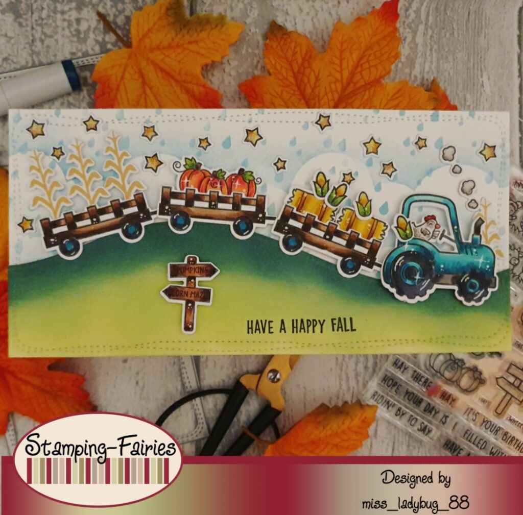 Ich habe mir dann mein Stempelset Hay there, Hayride geschnappt und meine Motive wie gewohnt mit Alkoholmarker coloriert . Gudrun das Huhn fährt nen Traktor mit 3 Anhängern🤣😅. Ich habe erstmal alles trapiert und sie dann auf meine Karte geklebt. Dazu habe ich 3D Foam Tape und Flüssigkleber benutzt. Dieses Set macht wirklich Spaß!