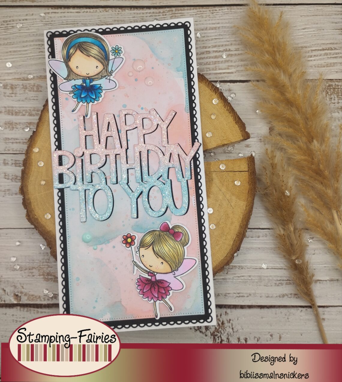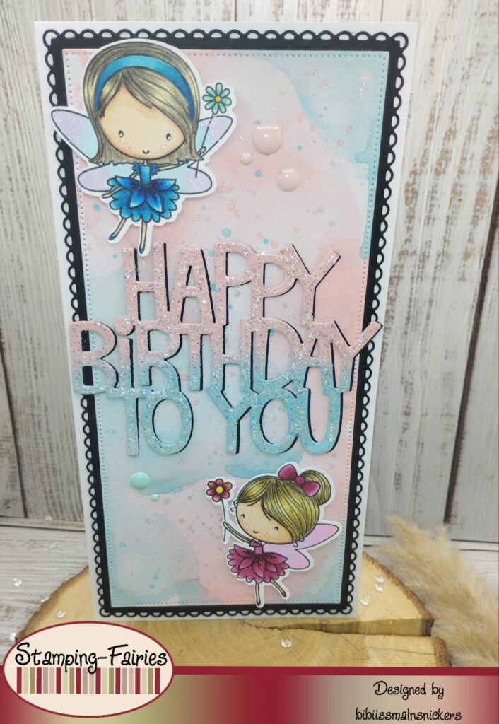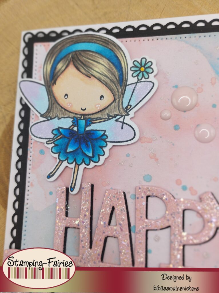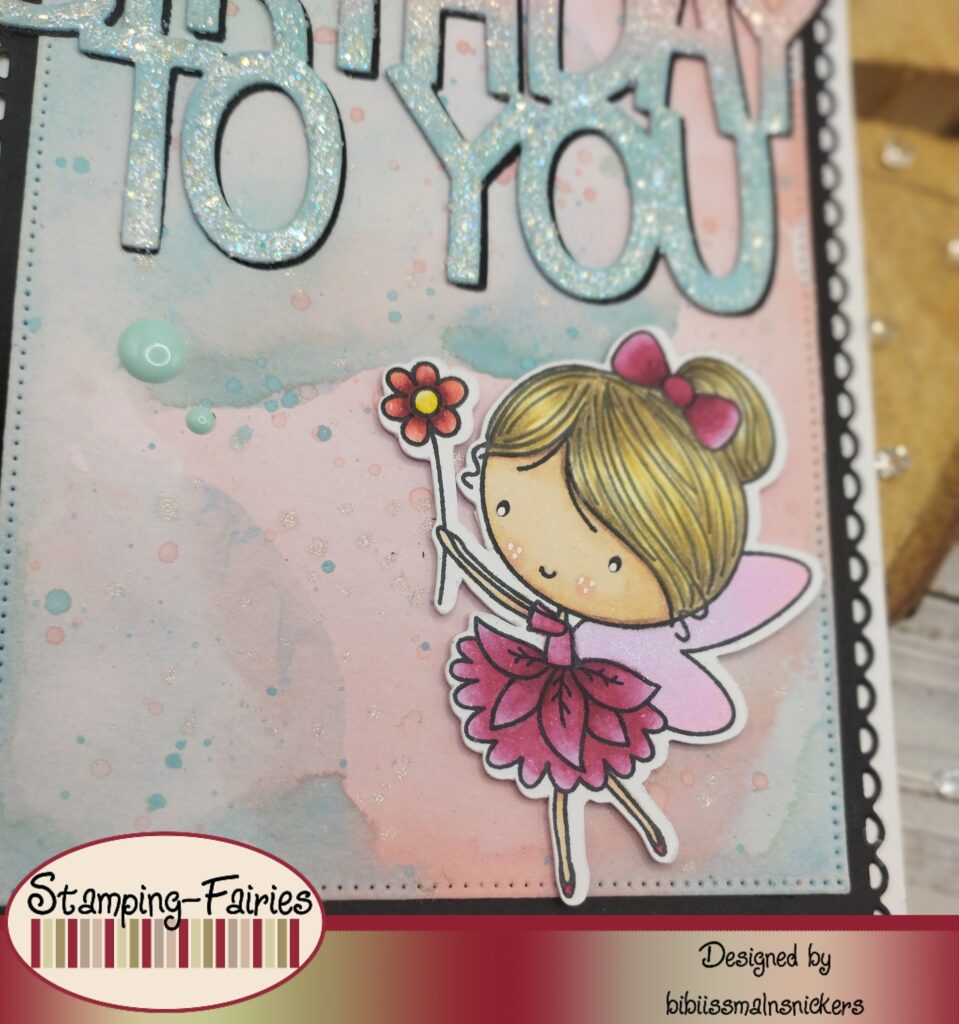 Das Happy Birthday to you habe ich dann ebenfalls in den Farben Salvaged Patina und Saltwater Taffy eingefärbt und direkt auf das schwarze geklebt. Den weißen Kartenaufleger habe ich dann auf meine Grundkarte geklebt und das Happy Birthday to you versucht so mittig auf die Karte zu kleben wie es ging. Mit 3D Klebepads habe ich die süßen Feen auf der Karte befestigt und ein paar Enamel Dots mit aufgeklebt.
