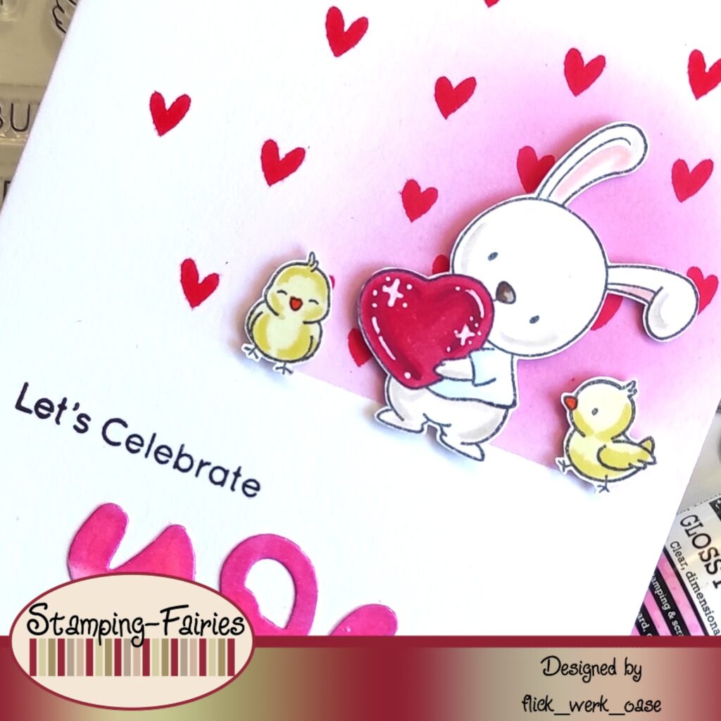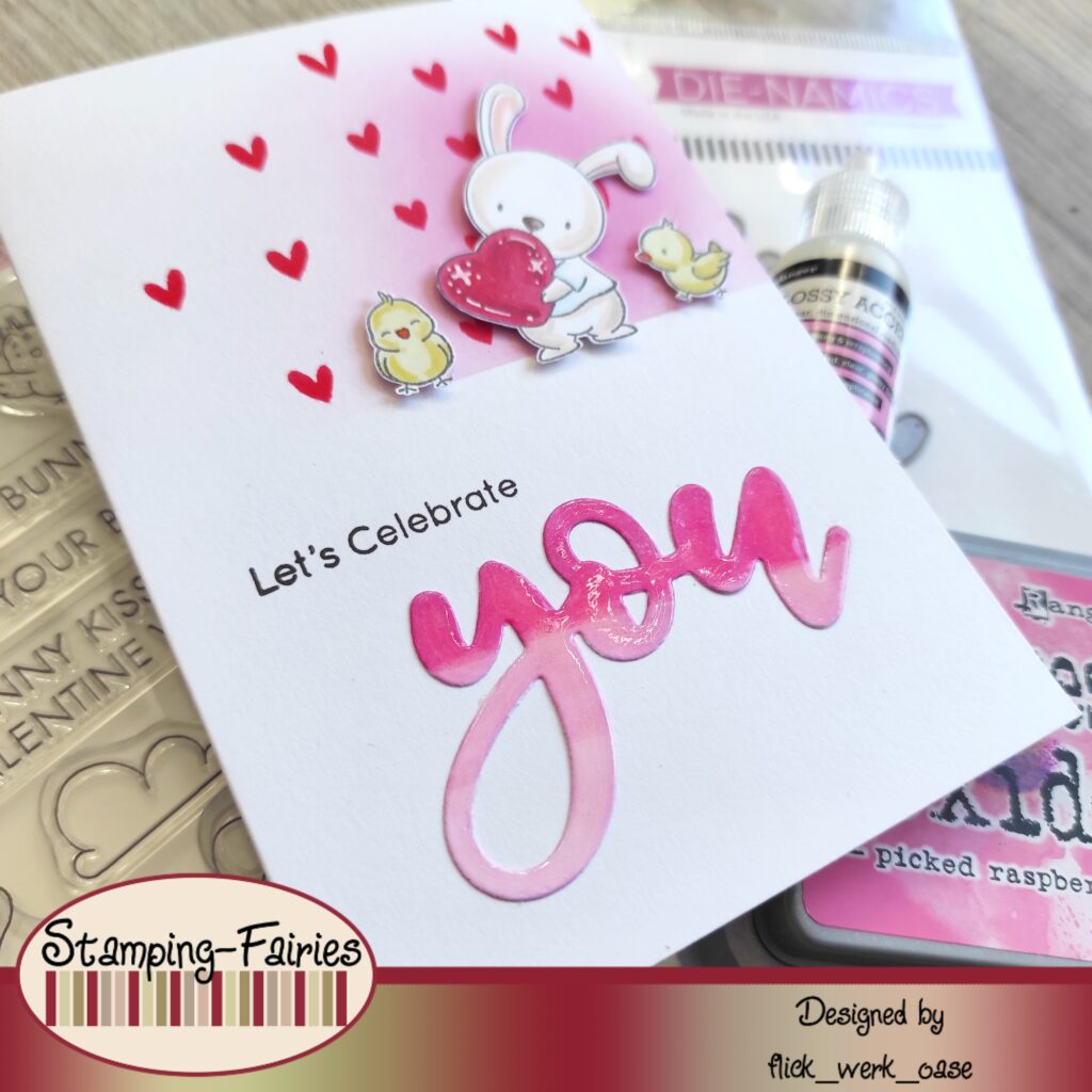 Im unteren Teil der Karte kommt eine Kombination aus gestempeltem Text und einer Wortstanze von My Favorite Things. Die “You”- Stanze von My Favorite Things ist schon etwas älter. Ausgestanzt aus dem “Card Stock von Craft Emotions Glatt – Weiß” habe ich das Wort mit Alkoholmarkern koloriert. Den Glanz hat das Wort mit etwas “Glossy Accents” von Ranger erhalten. Hier muss man aufpassen, dass keine sichtbaren Luftblasen entstehen. Wenn doch, dann einfach mit einem Zahnstocher zum Rand ziehen und weg ist die kleine gemeine Blase. Hab ich tatsächlich nicht darauf geachtet und nun hat mein „you“ eine Luftblase. Aber zum Glück sieht man sie kaum. 🙂
