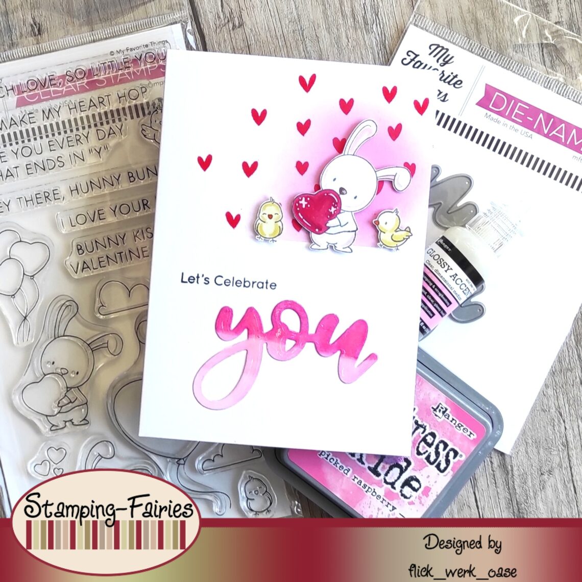 Für diese schnelle und unkomplizierte Karte habe ich ich mir aus dem “Card Stock von Craft Emotions Glatt – Weiß” einen Kartenrohling gefertigt. Auf diesem habe ich direkt mit Tape den oberen Bereich so abgeklebt, dass dort dann stimmig mein kleiner Hase aus dem Stempelset “Hunny Bunny” von My Favorite Things platz nehmen kann. Gewischt habe ich mit dem Farbton “picked raspberry” von Distress Oxide nur ansatzweise, vorsichtig und nach außen hin auslaufend. Die Herzchen sind passend zum Hintergrund mit einem Aquarell-Pinsel-Stift aus meiner Sammlung entstanden.