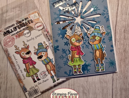 Die Critter sind aus dem MFT Stempelset „Purr-fect Pairs“, diese habe ich mit meinen Alkoholmarkern coloriert. Anschließend habe ich noch den passenden Spruch mit Versamark Ink gestempelt, wie immer wollte ich weiße Schrift auf schwarzem Hintergrund haben.