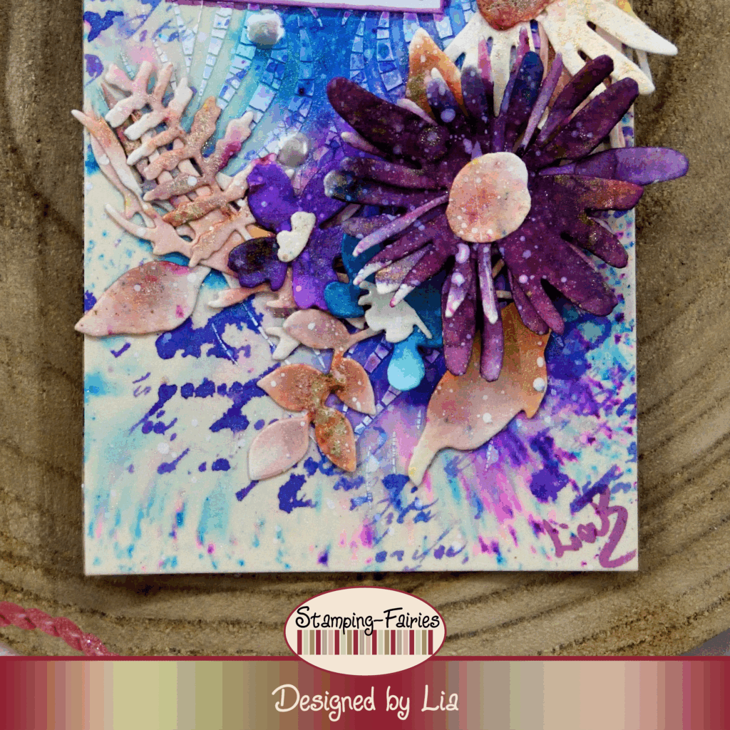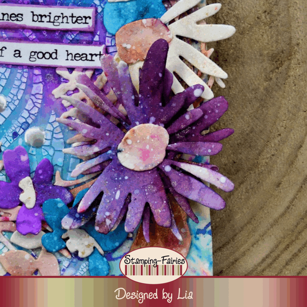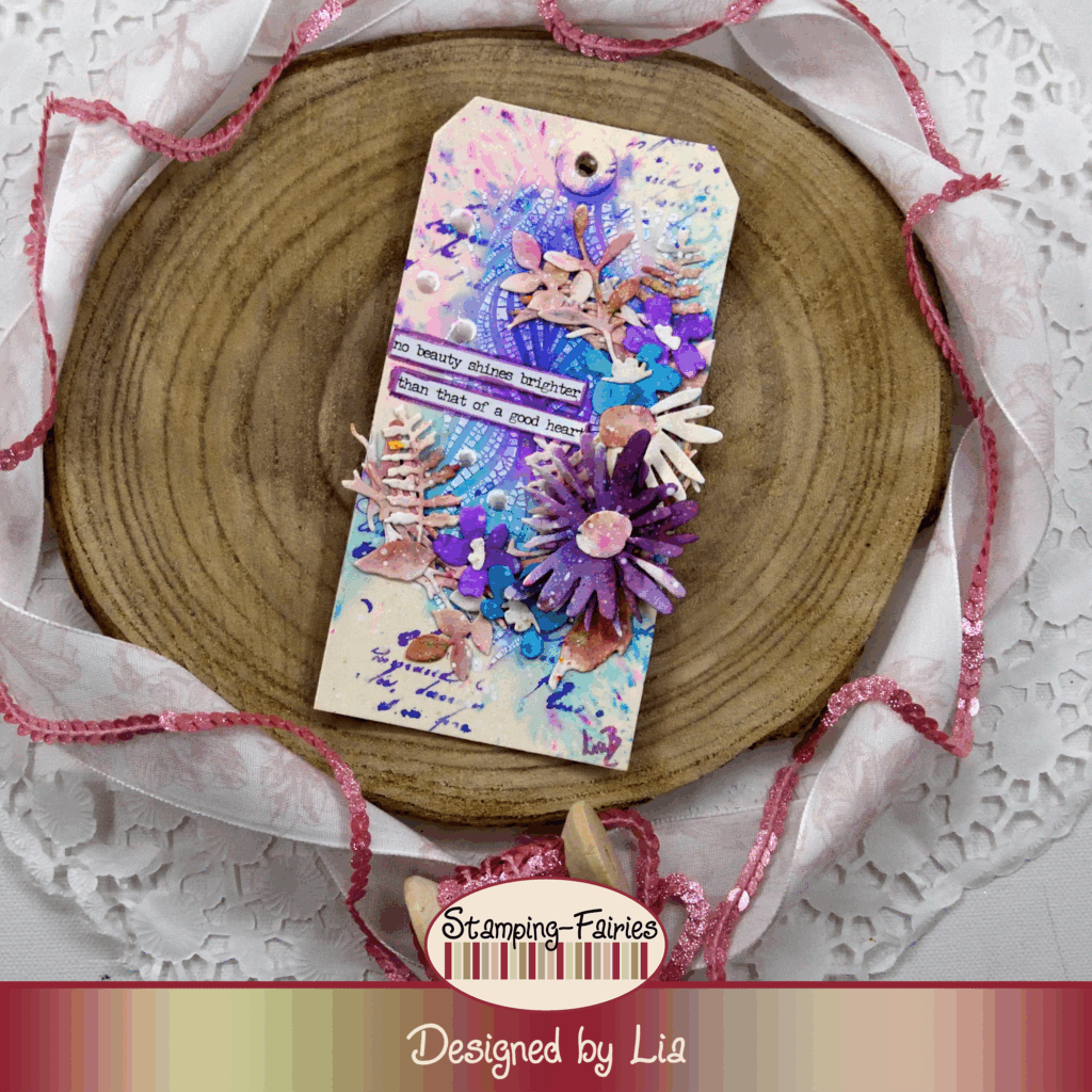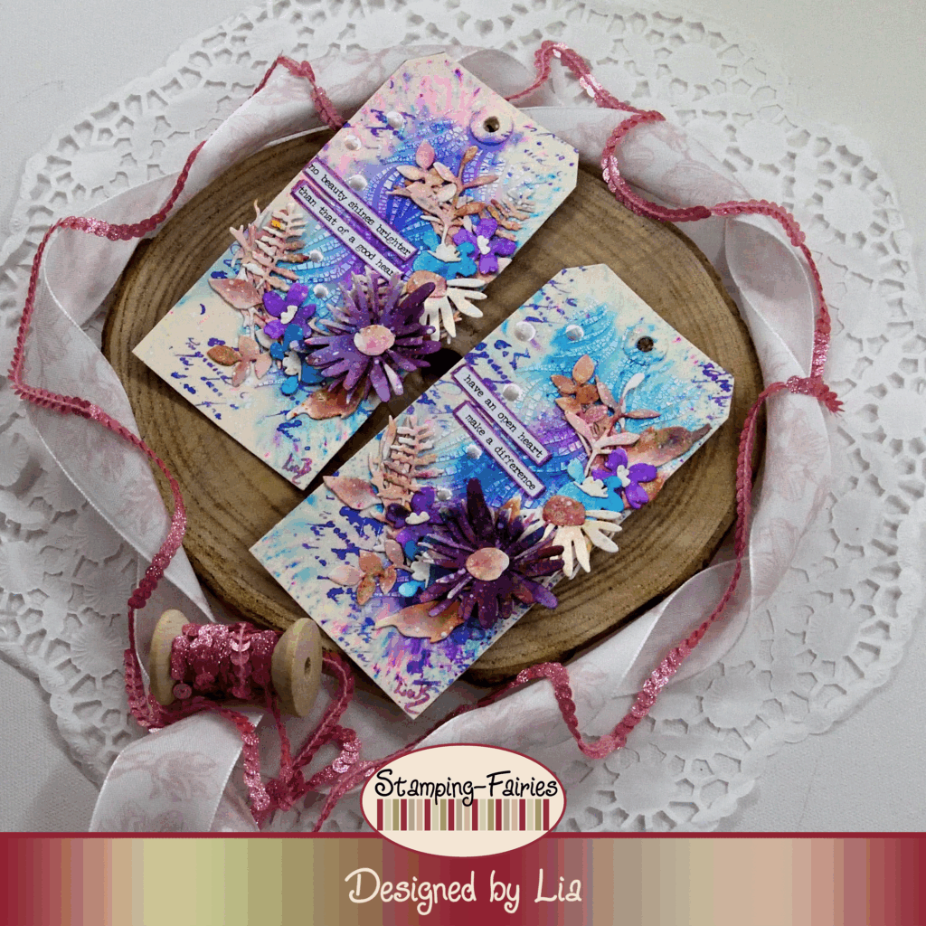 Time to prepare my images. I cut a wreath, some foliage and flowers, all out of watercolour paper. For the wreath and some of the foliage, I used the Sizzix Vault Foliage Wreath Thinlits set. For my flowers and the rest of the foliage, I used the Sizzix Vault Floristry Sidekick Side-Order set. I coloured the wreath and all of the foliage pieces using the Canadia Bacon Blush Lindy’s Magical pigment powder. My flowers are also coloured with Lindy’s Magical pigment powders, in colours Gleaming Gold, Polite People Purple, French Lilac Violet and Delphinium Turquoise. I arranged my pieces on the Tags and then I splattered my project with Picket Fence Distress Paint (white) and with Sheer Shimmer Spritz Sparkle spray.