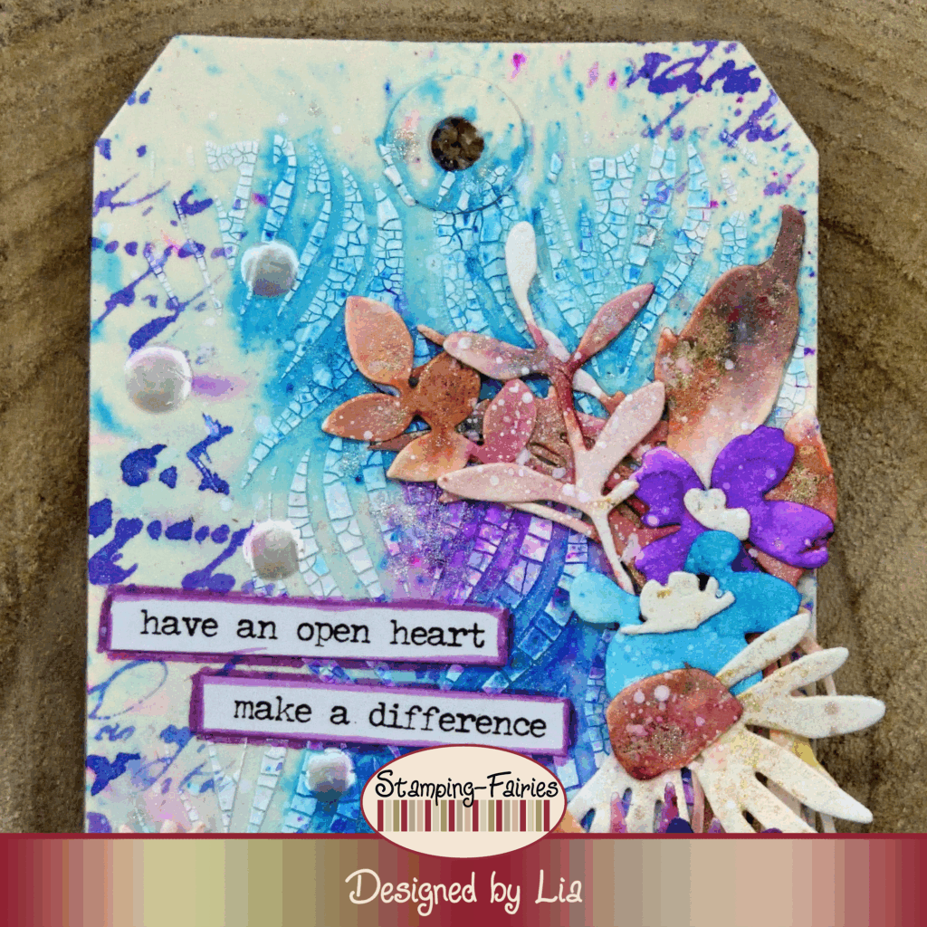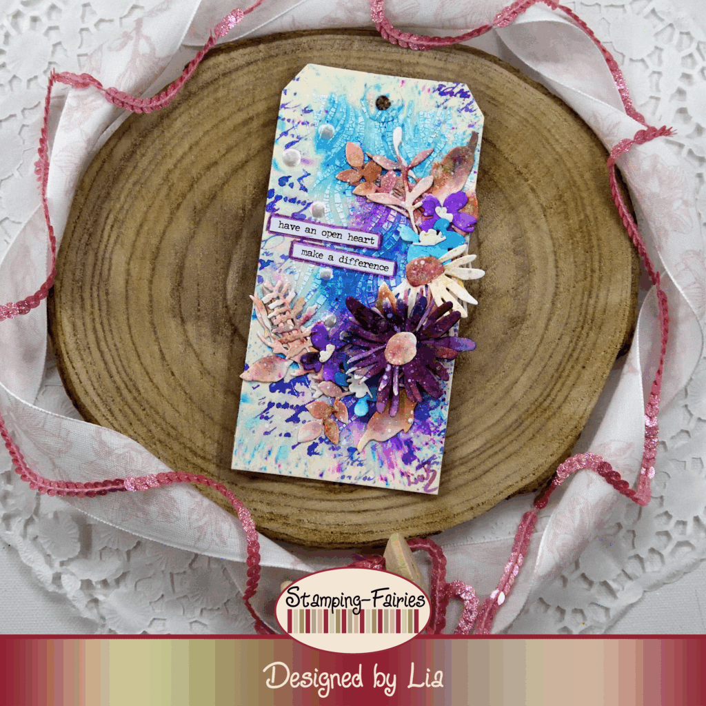 For today’s project, I made two Tags. I used Ranger Distress Heavyweight Tags and I covered them with clear Gesso. I dried the Gesso and then I added my texture, using the Deco Feather Layering stencil with Ranger Texture Paste Opaque Crackle. This Paste needs to be left to air dry, otherwise it does not crackle. So, I allowed my Paste to dry and then I added colour. I used Lindy’s Magical pigment powders in colours Delphinium Turquoise, French Lilac Violet and Milky Way White. I lightly sprayed the Tags with water and then I picked up the powders with a soft brush and dusted them over the Tags. I sprayed with more water to dilute the pigments, let the colours move and blend a little bit and then I dried the Tags. I mixed the Delphinium Turquoise and French Lilac Violet on my craft mat and I picked the colour up with a text stamp from the Tim Holtz The Poinsettia stamp set. I added the colourful text detail on my Tags and then I dried again. And with that, my backgrounds were ready!