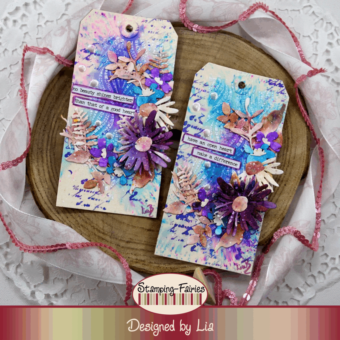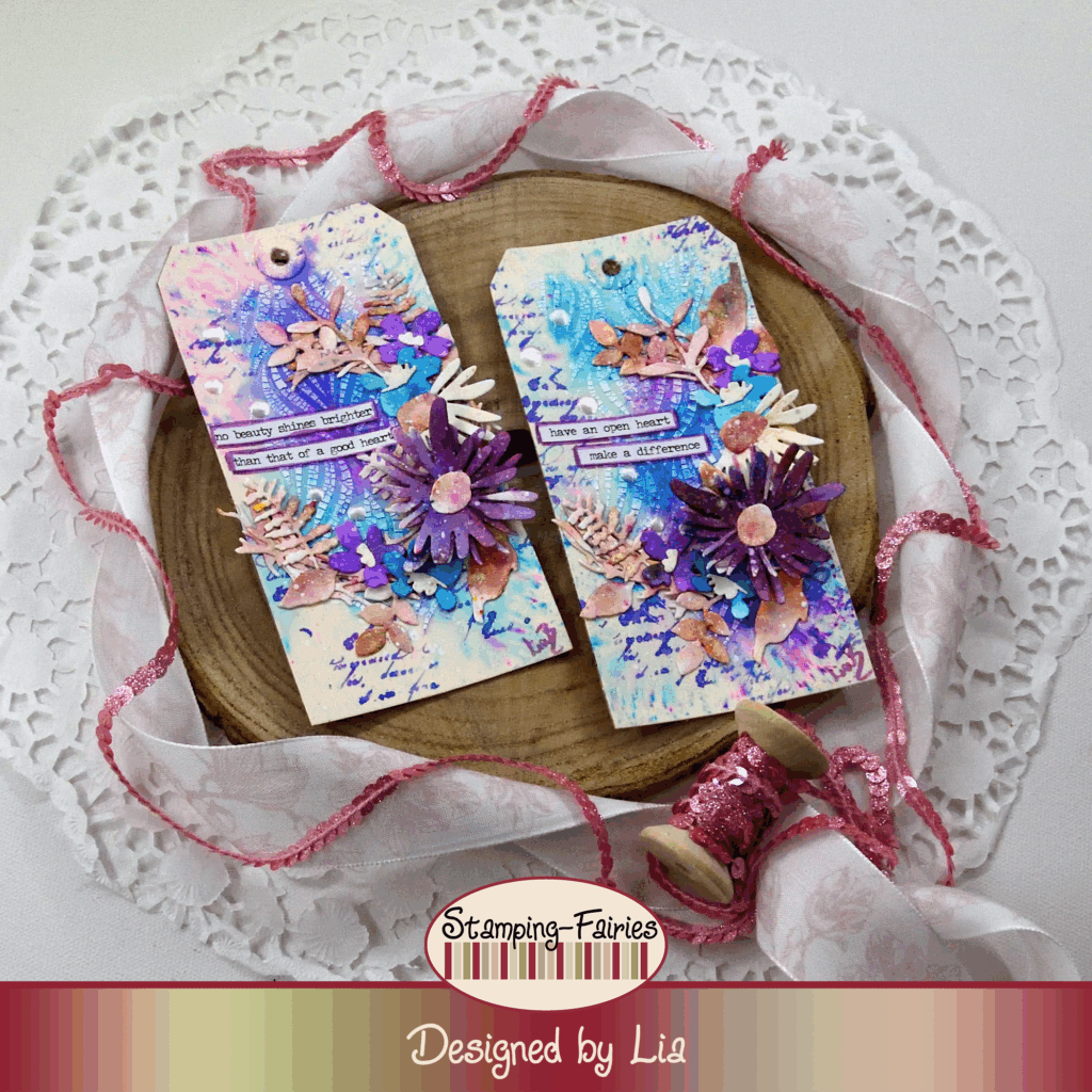 Für das heutige Projekt habe ich zwei Tags gemacht. Ich habe Ranger Distress Heavyweight Tags verwendet und sie mit klarem Gesso überzogen. Ich habe das Gesso getrocknet und dann meine Textur hinzugefügt, indem ich die Deco Feather Layering Schablone mit Ranger Texture Paste Opaque Crackle verwendet habe. Diese Paste muss an der Luft trocknen, sonst knistert sie nicht. Also habe ich meine Paste trocknen lassen und dann Farbe hinzugefügt. Ich habe Lindys Magical Pigmentpulver in den Farben Delphinium Turquoise, French Lilac Violet und Milky Way White verwendet. Ich habe die Tags leicht mit Wasser besprüht und dann das Pulver mit einem weichen Pinsel aufgenommen und über die Tags gestäubt. Ich habe mit mehr Wasser besprüht, um die Pigmente zu verdünnen, die Farben sich bewegen und ein wenig vermischen gelassen und dann habe ich die Tags getrocknet. Ich habe Delphinium Turquoise und French Lilac Violet auf meiner Bastelmatte gemischt und die Farbe mit einem Textstempel aus dem Stempelset „The Poinsettia“ von Tim Holtz aufgenommen. Ich habe die bunten Textdetails auf meinen Tags hinzugefügt und anschließend erneut getrocknet. Und damit waren meine Hintergründe fertig!
