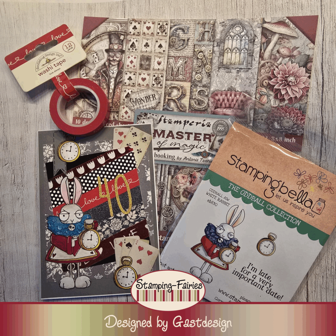 Wer kennt das nicht, man möchte gerne mal Washitape benutzen aber weiß nicht wie. Ich habe es jetzt einfach als Hintergrund genommen für meine Karte. Ein paar Rote und Schwarze Taps rausgesucht, aufgeklebt und schon hab ich einen tollen Hintergrund für meine Geburtstagskarte. Den Bunny habe ich mit Aquarellstiften Coloriert. Ein Grauen Aufleger und noch etwas Designerpapier in den Hintergrund geklebt und da war die Karte schon Fast fertig, ein paar Spielkarten durften noch mit rauf. (Ähnliche Karten gibt´s im Paper Pack von Stamperina Master of Magic) Das Geburtstagskind wird 40 Jahre diese Zahl habe ich aus Goldenem Glitzerpapier ausgestanzt.