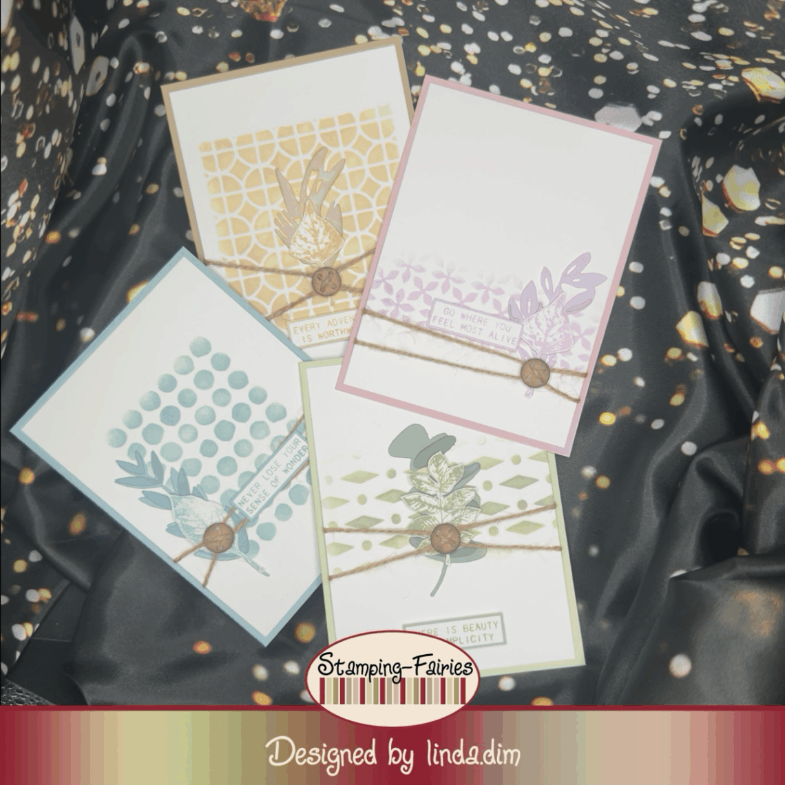 Nun konnte ich alles zusammensetzen: Hintergrund, farblich passende Blätter, den Knopf mit durchgefädelter Naturkordel, die ich auf der Rückseite mit doppelseitigem Klebeband befestigte sowie den jeweiligen Spruch, den ich mit einem kleinen Stück des mit Distress Oxide eingefärbten Cardstocks hinterlegte, und mit 3D Klebepunkten platzierte. Ich suchte mir farblich passende Basiskarten heraus und klebte meine Kartenfronten jeweils mit doppelseitigem Klebeband auf. Vier auf einen Streich. Das war es für heute schon wieder.