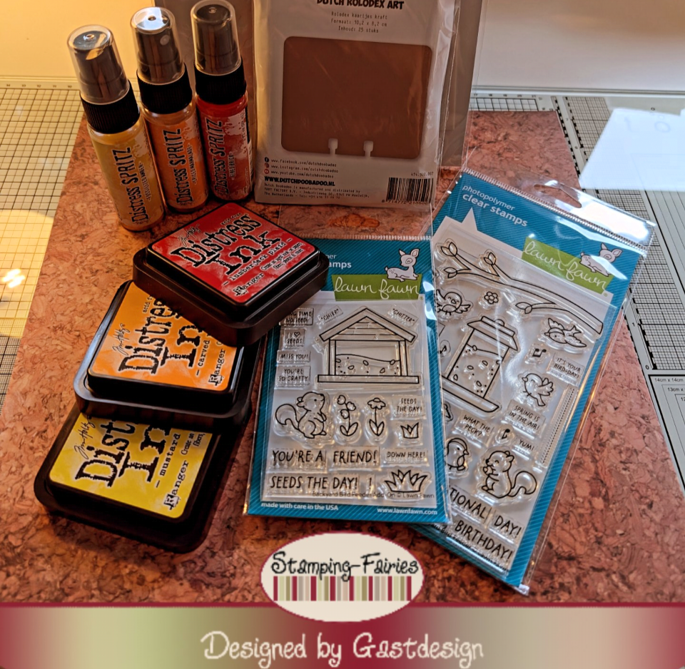 Als erstes habe ich den Autumn Breeze Stencil von Lawn Fawn mit den Distress Ink gewischt. Da dieser Stencil sehr filigrane Motive hat, habe ich dafür die Fingerschwämmchen zur Hilfe genommen. Anschließend habe ich die Distress Spritz einfach großzügig drüber gesprüht und dann die Memory-Dex Karte trocknen lassen.