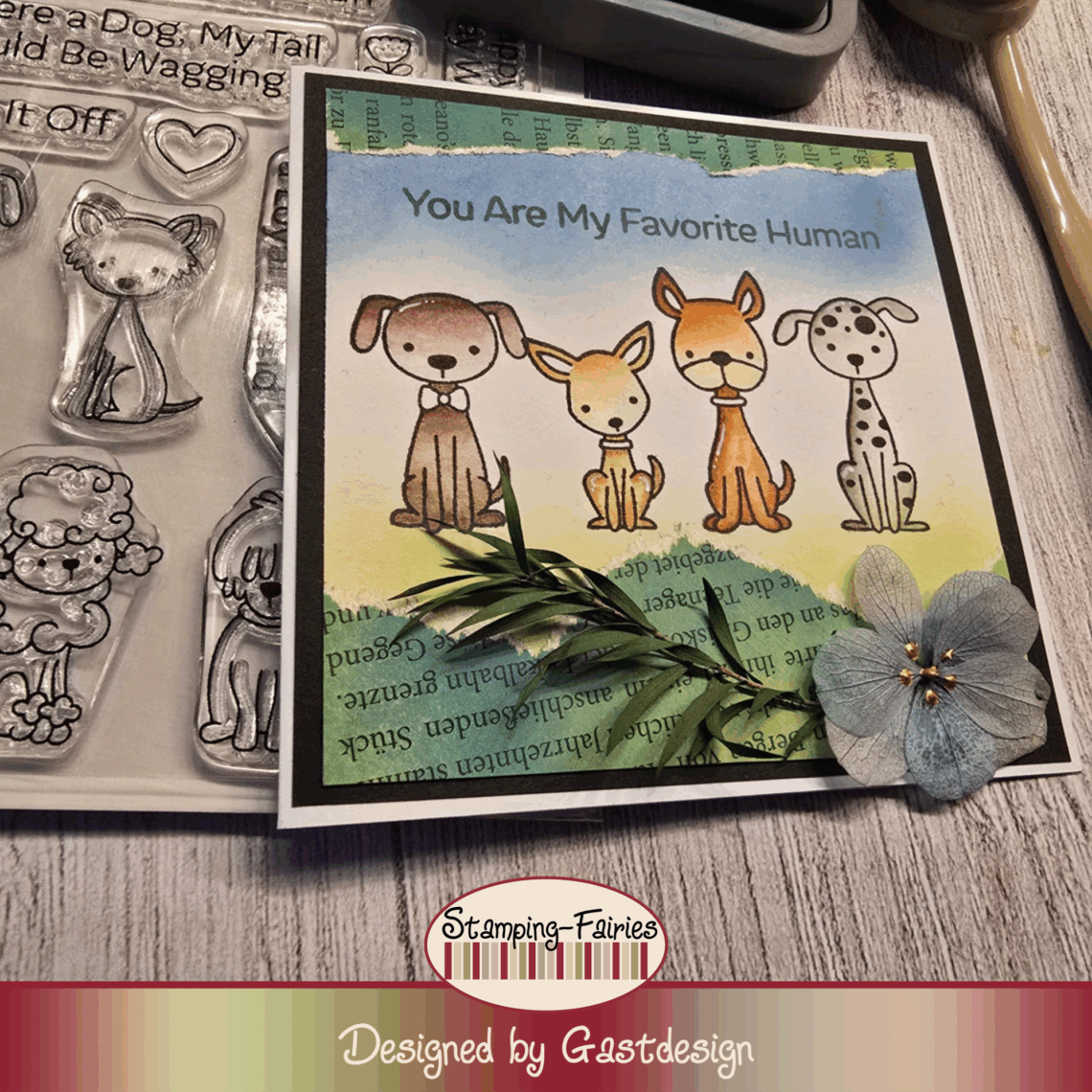 heute habe ich für euch eine kleine Karte. Ich habe mich hier für das Kartenformat 10cm x 10cm entschieden. Es sollte einfach eine Karte für einen Lieblingsmensch sein, und da Sie auch eine Hundeliebhaberin ist, passt dieses Stempelset Puppy Kisses von My Favorite Things perfekt zu Ihr. Den Hintergrund habe ich mit den Distress Oxide gewischt in Grün und Blau, da es mir aber dann doch zu Ruhig auf der Karte war, habe ich mir noch eine Buchseite genommen und diese auch eingefärbt und aufgeklebt. Trockenblumen durften irgendwie auch nicht fehlen und da habe ich mich auch passend zum rest für Blau und Grün entschieden. Ich hoffe die Karte kommt genau so gut an bei euch wie bei dem Lieblingsmensch.
