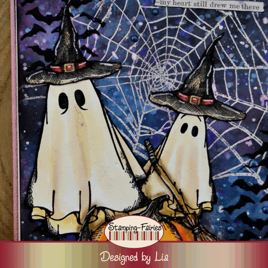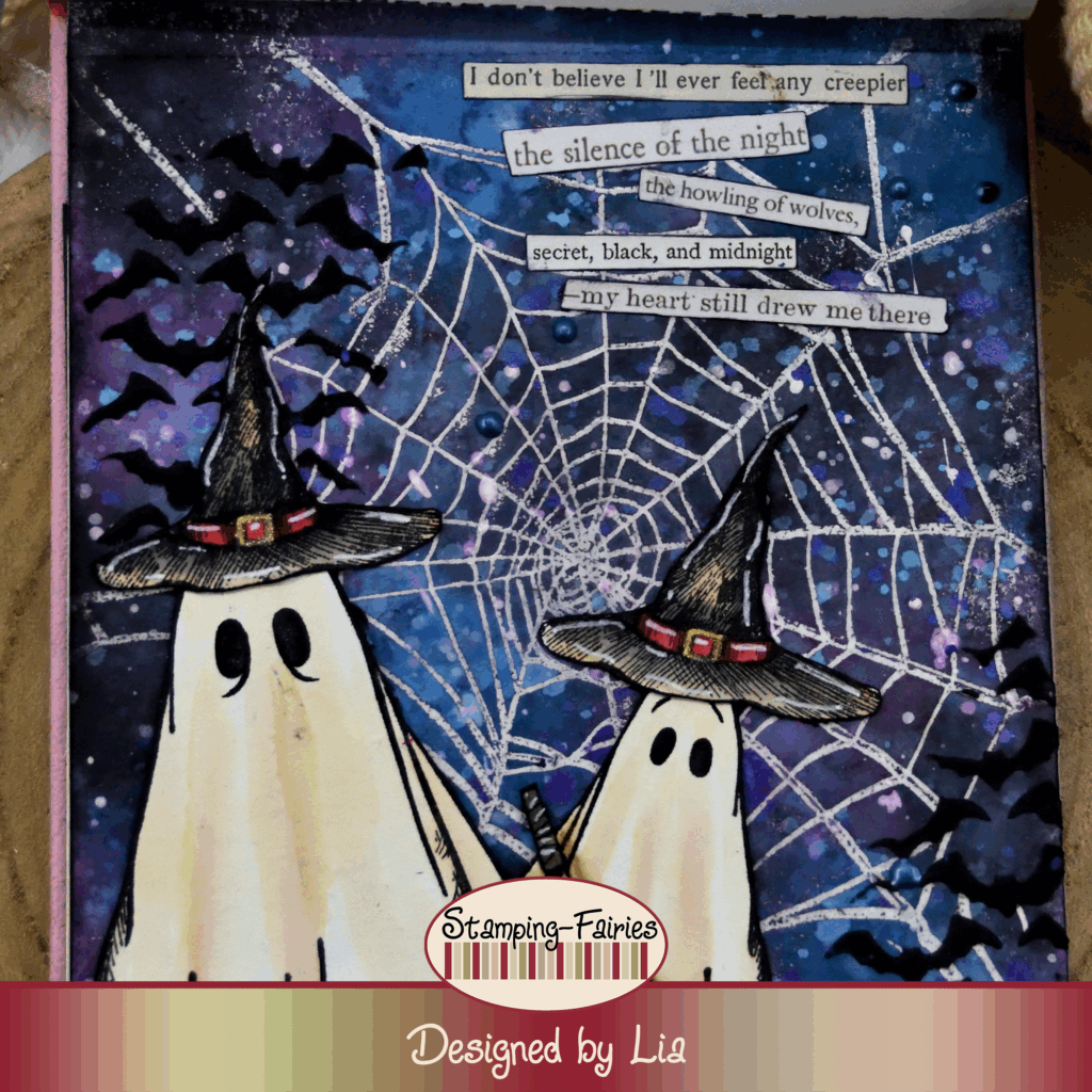 My sentiment comes from the Idea-Ology Curiosities Sticker Book. I chose several little sentences to create a little story. The sentiment says: „I don’t believe I ‚ll ever feel any creepier“, „the silence of the night“, „the howling of the wolves“, secret, black and midnight“, „My heart still drew me there!“. I think this little story is somewhat creepy and my ghosties are too cute, but it works! As a last little bit of embellishment, I added a few dots of Navy Blue Nuvo Crystal Drops.