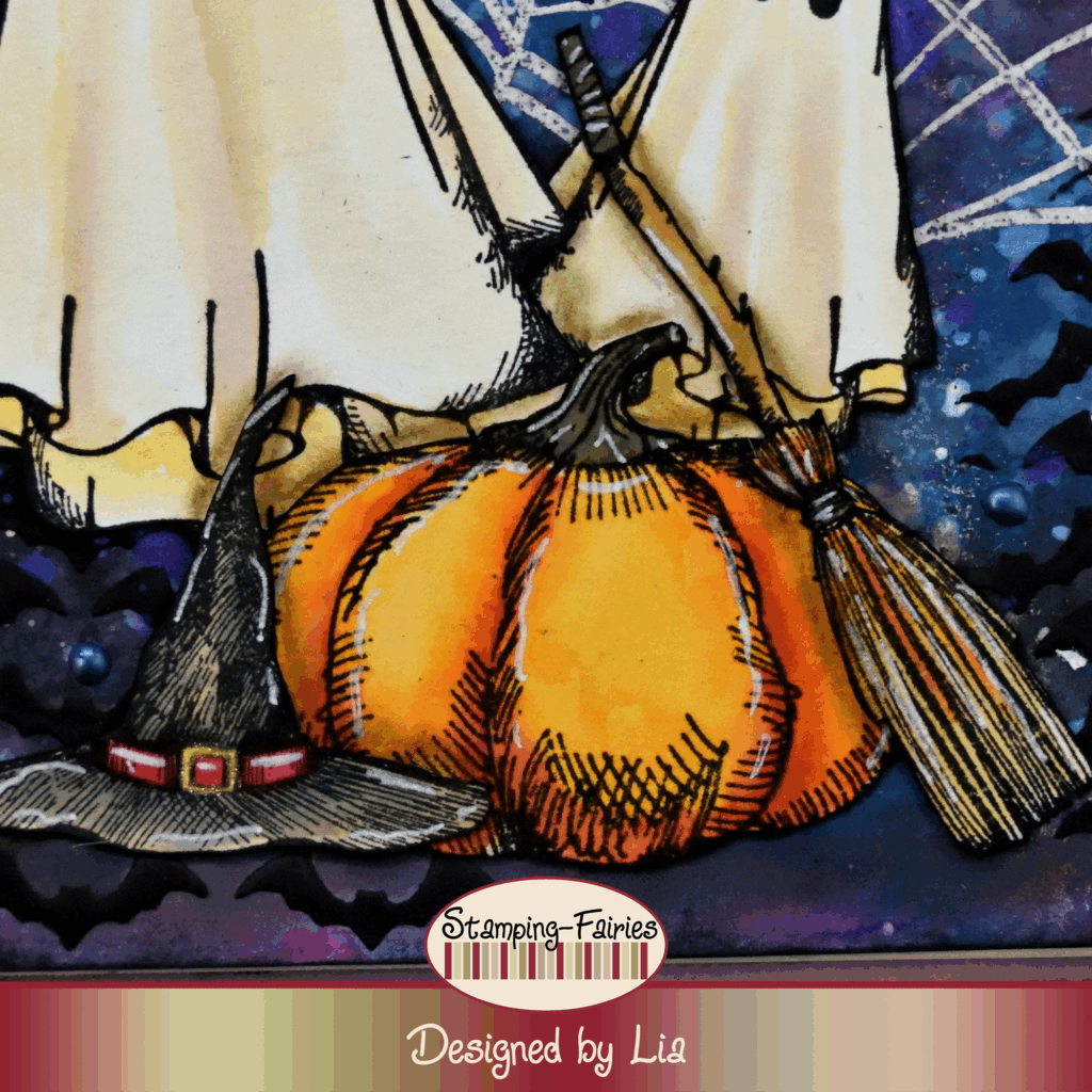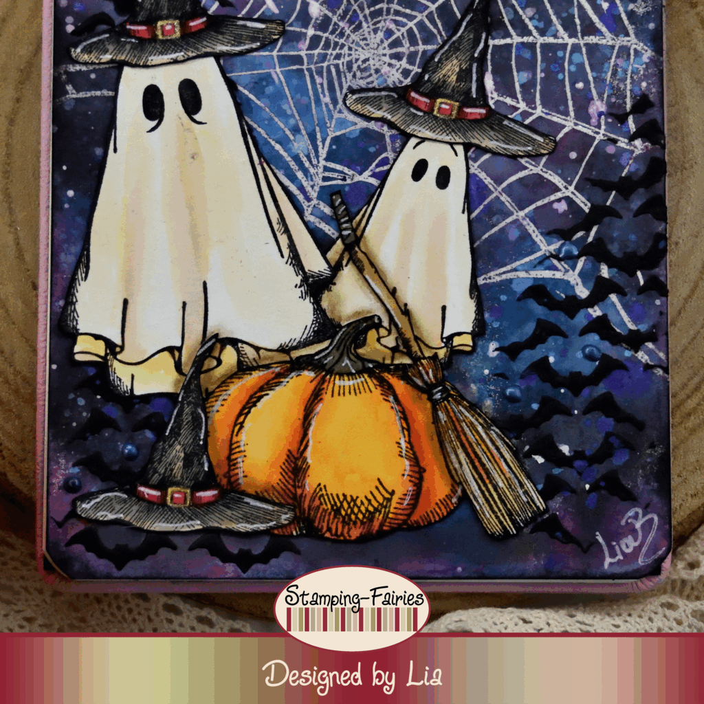 Time to prepare my images! My ghosts come from the Tim Holtz „Boo Crazy“ stamp set, and the rest of the images (the witch hats, the broom and the pumpkin) come from the Tim Holtz „Snarky Cat Halloween“ stamp set. They are stamped with Jet Black Archival ink and coloured with Distress inks in various colours. I cut them out, using the Tim Holtz Recoil Snips. These scissors are just amazing! My hands do not work as they used to and having the right tool for this job is important! I attached the images to the background, and then I used Ground Espresso Distress Oxide ink with a stiff brush to add some shadow around them.