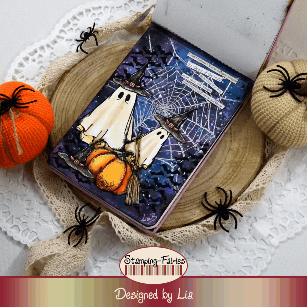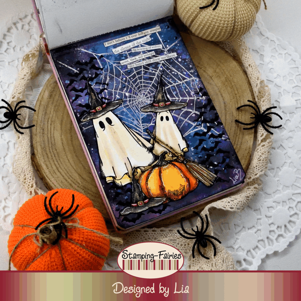 For this project, I worked in a watercolour book, and I started by applying a good layer of Gesso. I used Ranger Clear embossing powder to heat emboss the big spider web from the Tim Holtz „Boo Crazy“ stamp set on my background. To colour the page, I used Distress Oxide sprays, in colours Black Soot, Uncharted Mariner, Seedless Preserves and Dusty Concord. I splattered the page with Picket Fence (white) Distress Paint and with Salvaged Patina Distress Oxide spray. Then I added some texture, using the Batground Layering stencil with Ranger Black Opaque Texture Paste. I splattered the page with Hocus Pocus Distress Mica Stain spray, and the background was done.