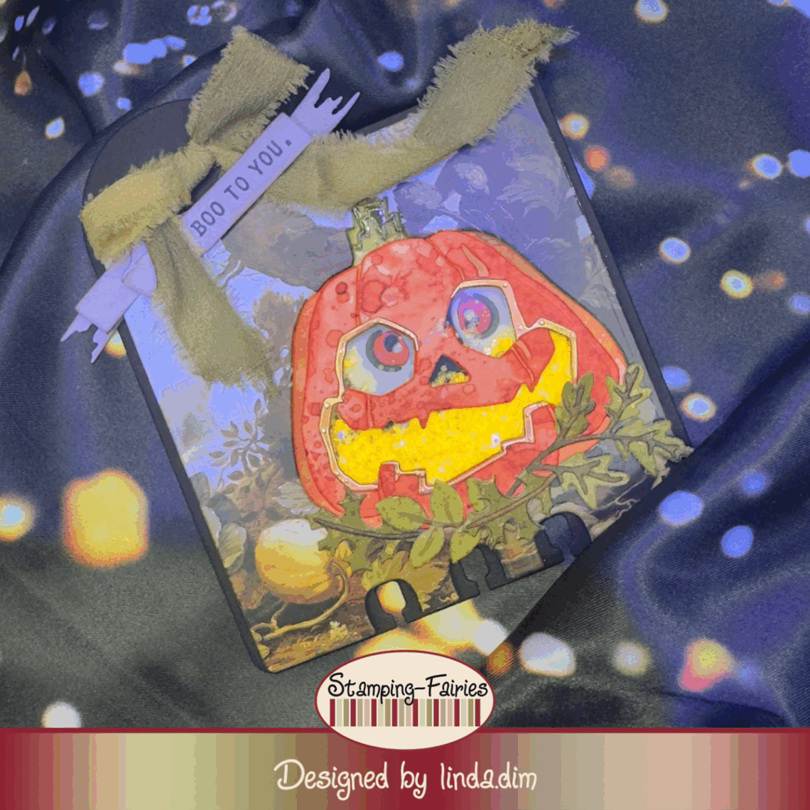Als Hintergrund wählte ich eine der Karten aus dem Set Halloween Layers and Paper Dolls 2024 von Tim Holtz aus und schnitt sie entsprechend zu. Mit der Basis-Stanze des Kürbisses stanzte ich ein kürbisförmiges Fenster aus, welches ich mit einem Stück Alcohol Ink Dura-Lar hinterklebte.