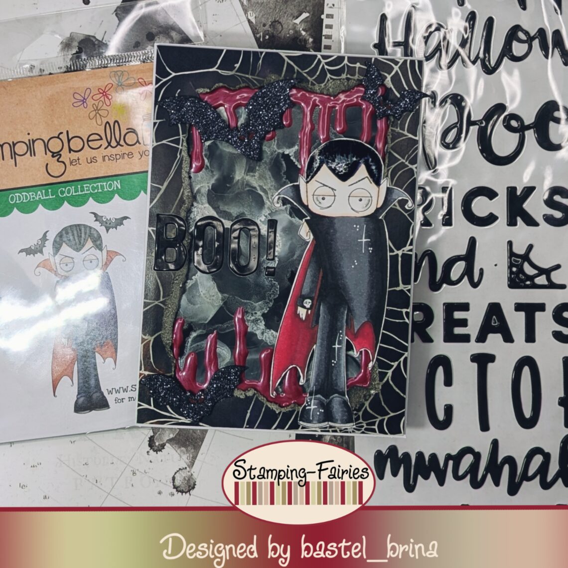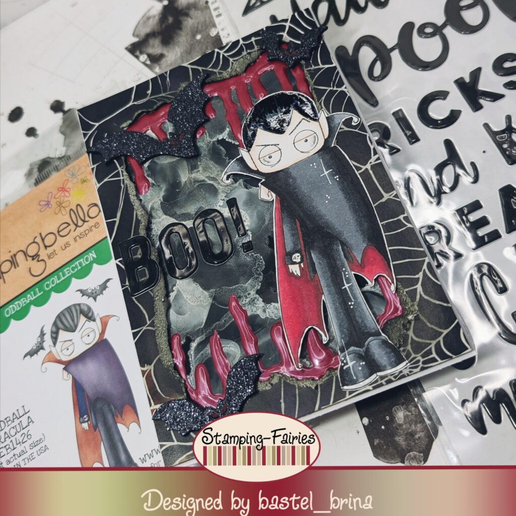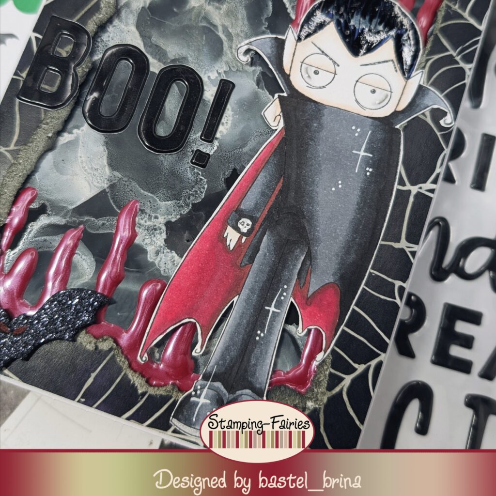 Den Oddball Dracula habe ich coloriert und ausgeschnitten. Die Haare habe ich mit Glossy accents zum glänzen gebracht weil in meiner Vorstellung Dracula eine 1a gestylte Gelfrisur hat. 😅