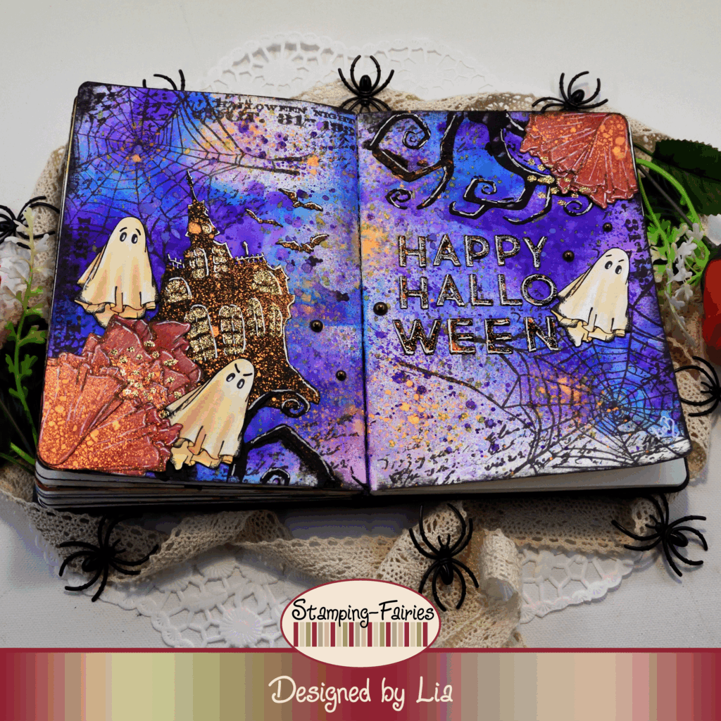 My sentiment comes from the Sizzix Bold Text Halloween Thinlits set and it is cut out of black cardstock. I used the Spiced Marmalade Distress Spritz on the letter, because I like the shine! I placed it on my right page and then I covered it with Glossy Accents. The sentiment says: „Happy Halloween“, the most simple and classic phrase of the season. You think I am done? Think again! At this point I added more splatter to the pages, using Spiced Marmalade Distress Spritz. Then I used the Ranger Gold Stickles to fill the windows of the castle and to create the pollen of the flowers. As a last little bit of embellishment, I added some Idea-Ology Droplets from the Halloween pack…. and then I was done… (but not willingly! I could keep going!!!)