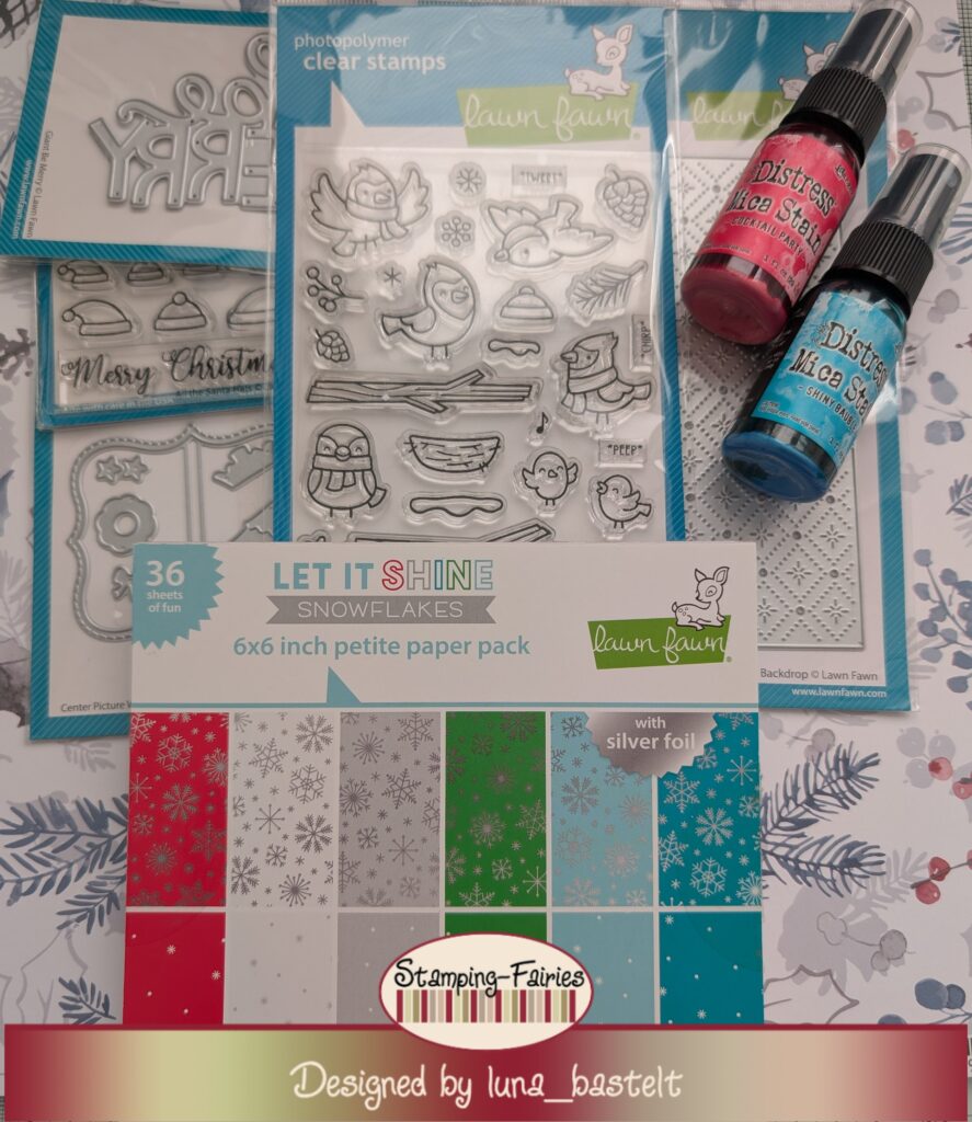 - Papier & Alben – Aquarellpapier, Cardstock dunkelblau, Glitzer- & Spiegelkarton, Lawn Fawn „Let it shine snowflakes“