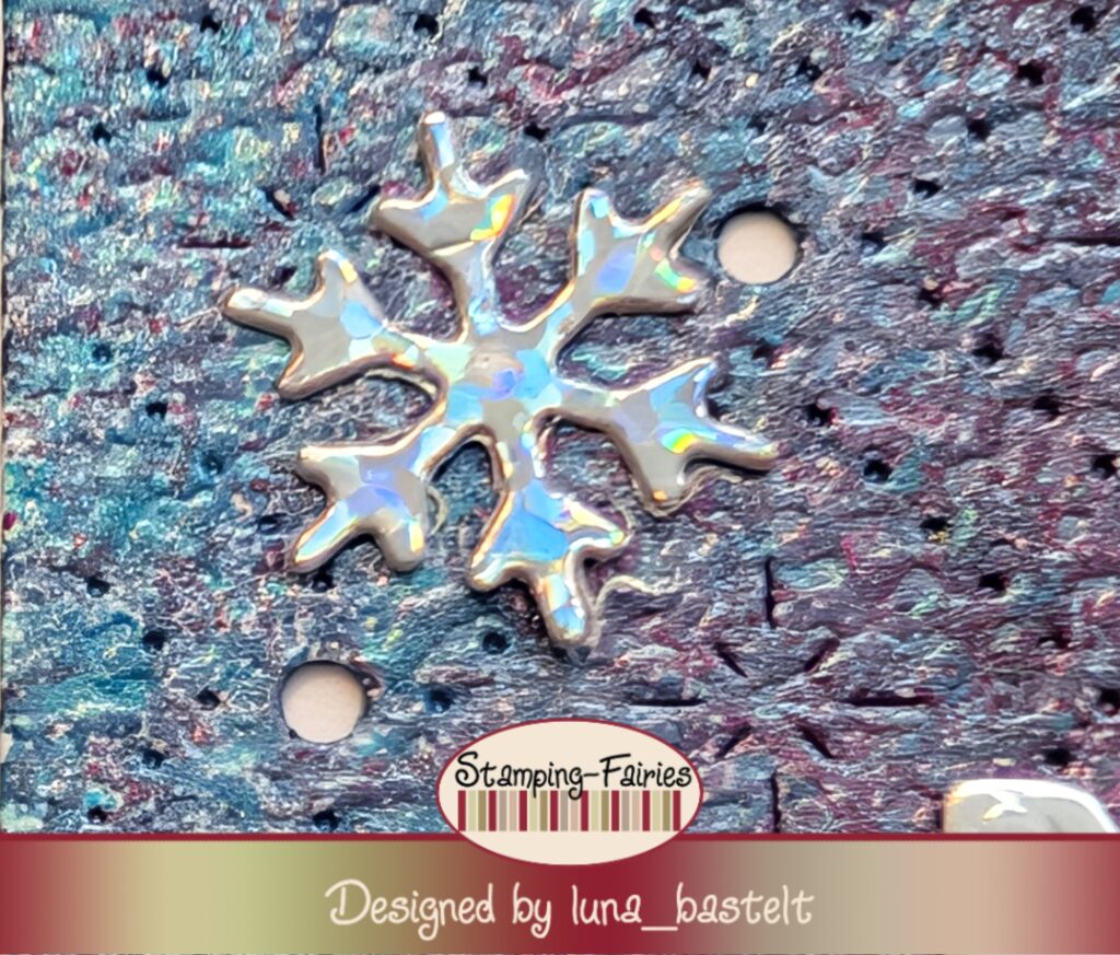 Nachdem der Aufleger getrocknet war, habe ich das Fenster ausgestanzt und den Aufleger auf der Schneeflockenpapier geklebt.