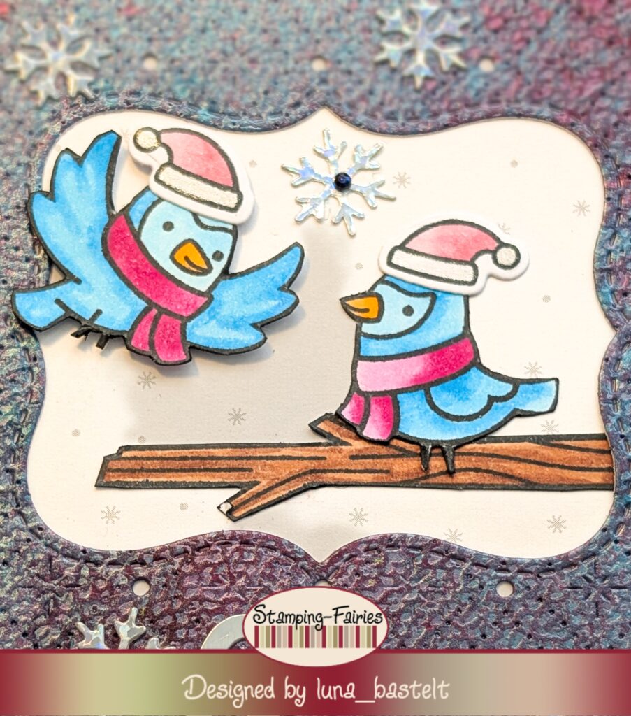 Während der Trocknungszeit habe ich mit dem Memento die Winter Birds und Santa Hats gestempelt und mit Copics coloriert. Anschließend habe ich alles ausgeschnitten und den Birds die Santa Hats aufgesetzt.