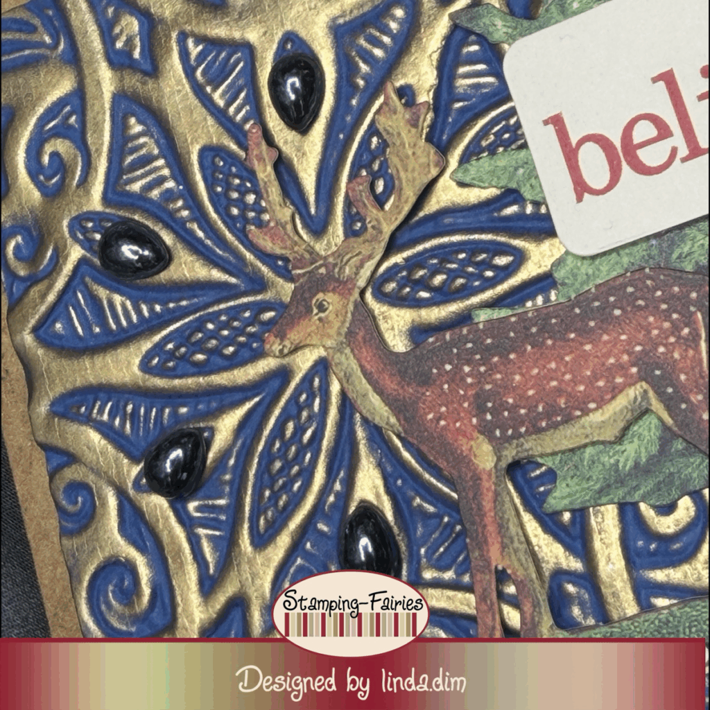 Für die zweite Karte embosste ich mit dem 3D Embossing Folder Engraved ein Stück blauen Cardstock. Über das erhabene Muster rieb ich mit einem Distress Ink Blending Tool goldenes Wachs, um die Struktur hervorzuheben. Wichtig: dieses Blending-Schwämmchen bitte nicht mehr für Tinte benutzen. Legt es Euch für die nächste Applikation von Wachs beiseite!