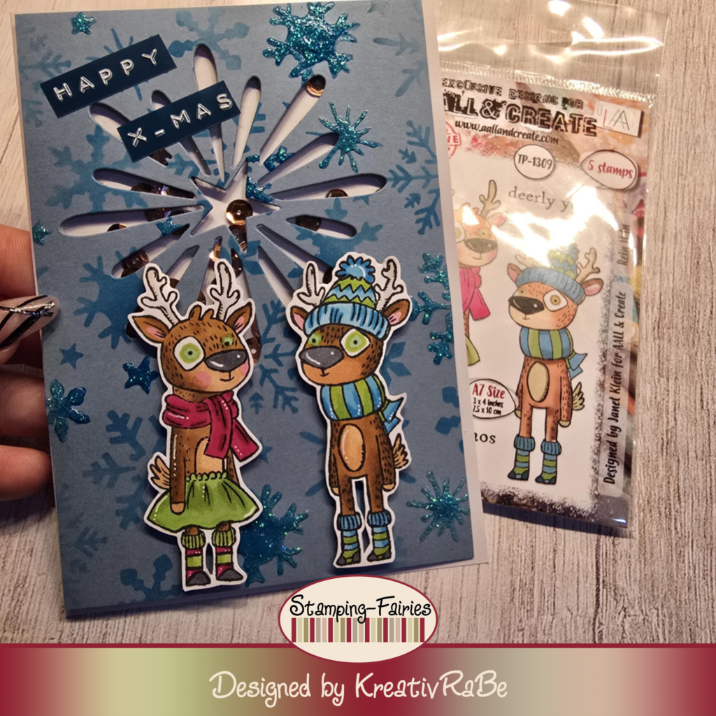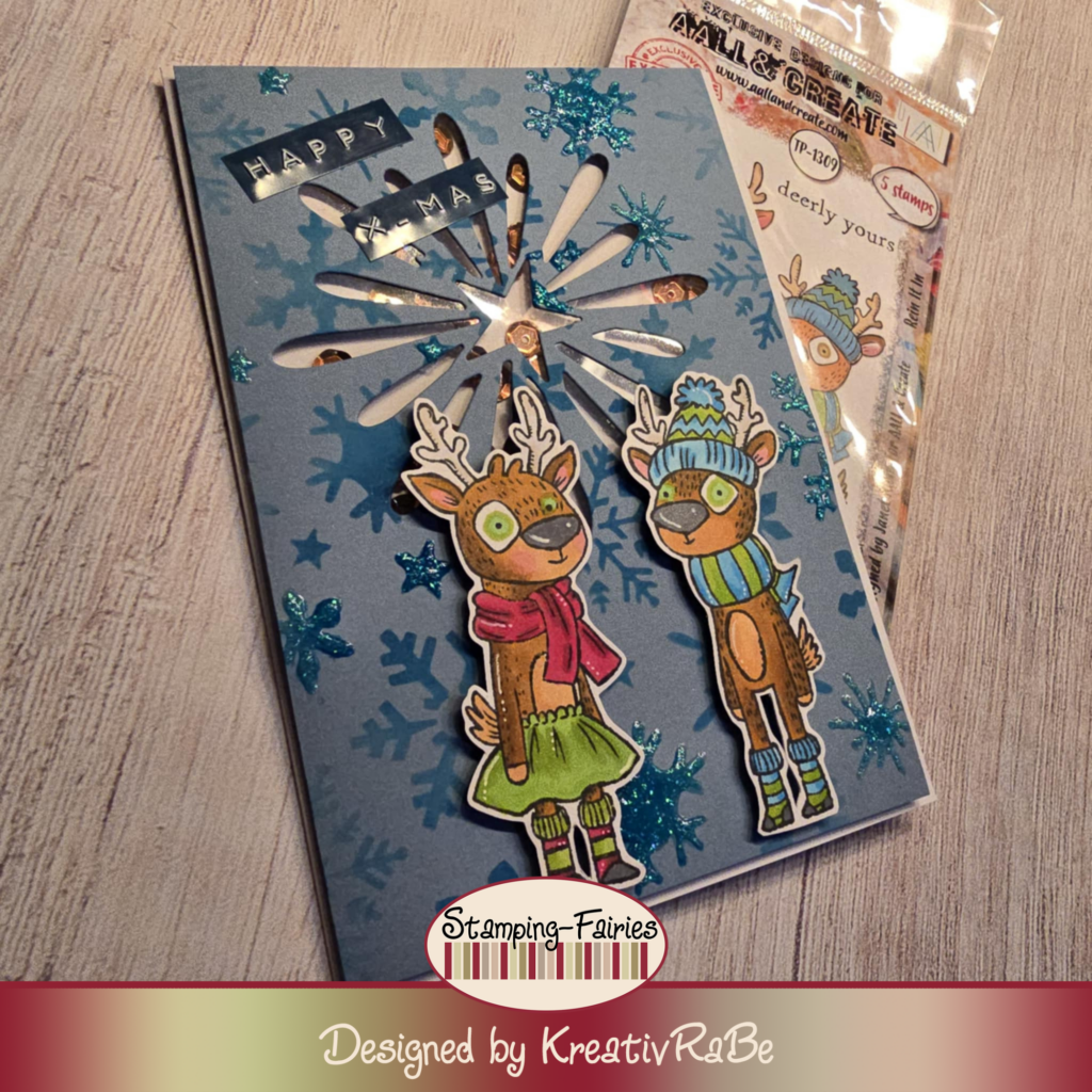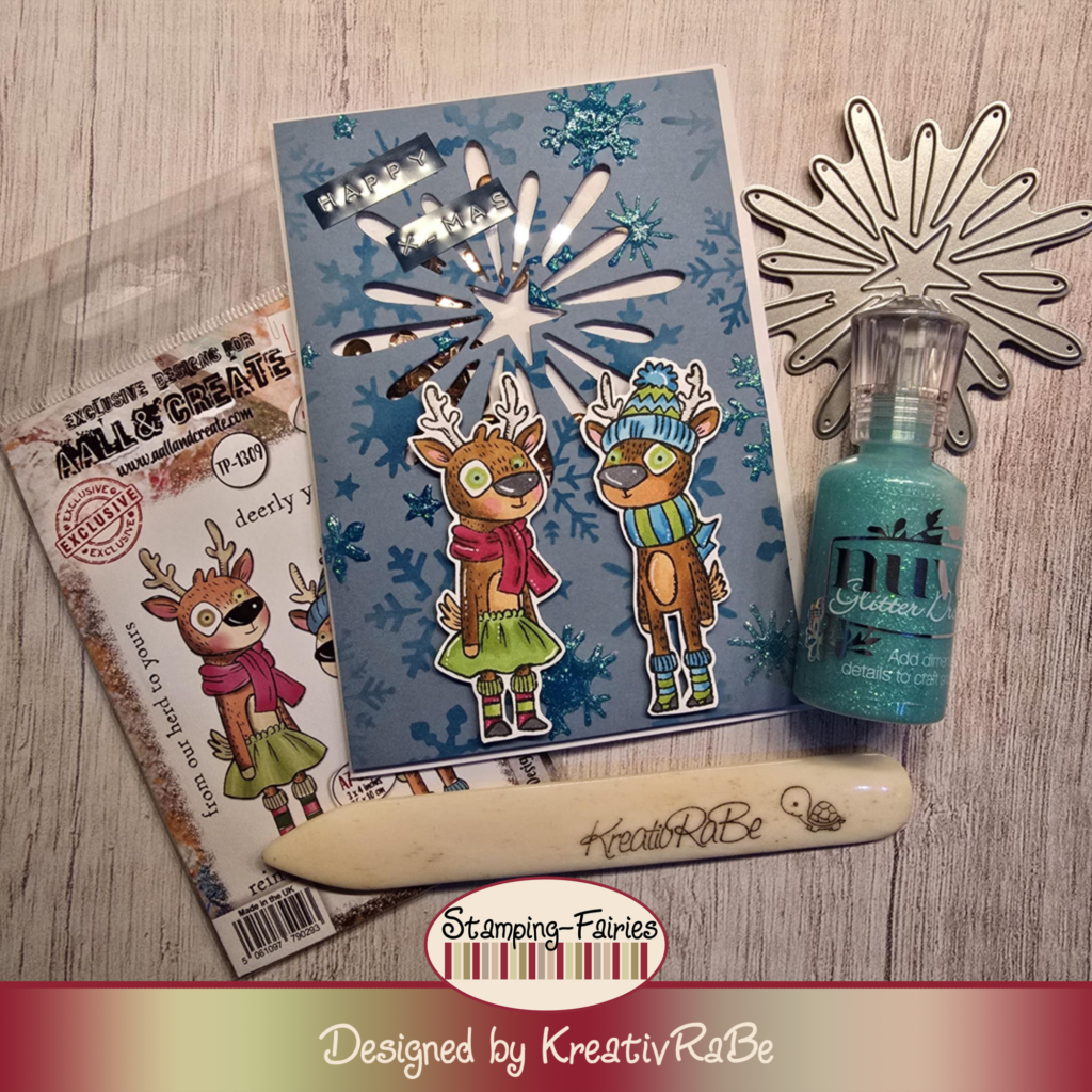 heute habe ich für euch eine weitere Weihnachtskarte. Dieses mal mit einem Schütteleffekt, hinter dem Stern habe ich Gold/Bronze Schimmer Pailletten versteckt. Wenn man die Karte also bewegt, raschelt es hinter dem Stern. Ich habe mir Blauen Cardstock zusammen geschnitten und habe mit einem Dunkleren Blauton Schneeflocken gewischt. Mit einem Stencil von Stamperia. An ein paar Stellen des Auflegers habe ich Nuvo Glitzer Drops benutzt. Und zwar habe ich die Großflächig verteilt das einige Schneeflocken hervorstehen. Meine kleinen Süßen Elche sind von All & Create das Set TP-1309 Rein It In diese habe ich mit Alkoholmarkern coloriert. Nun Zeige ich euch auch meine Karte.