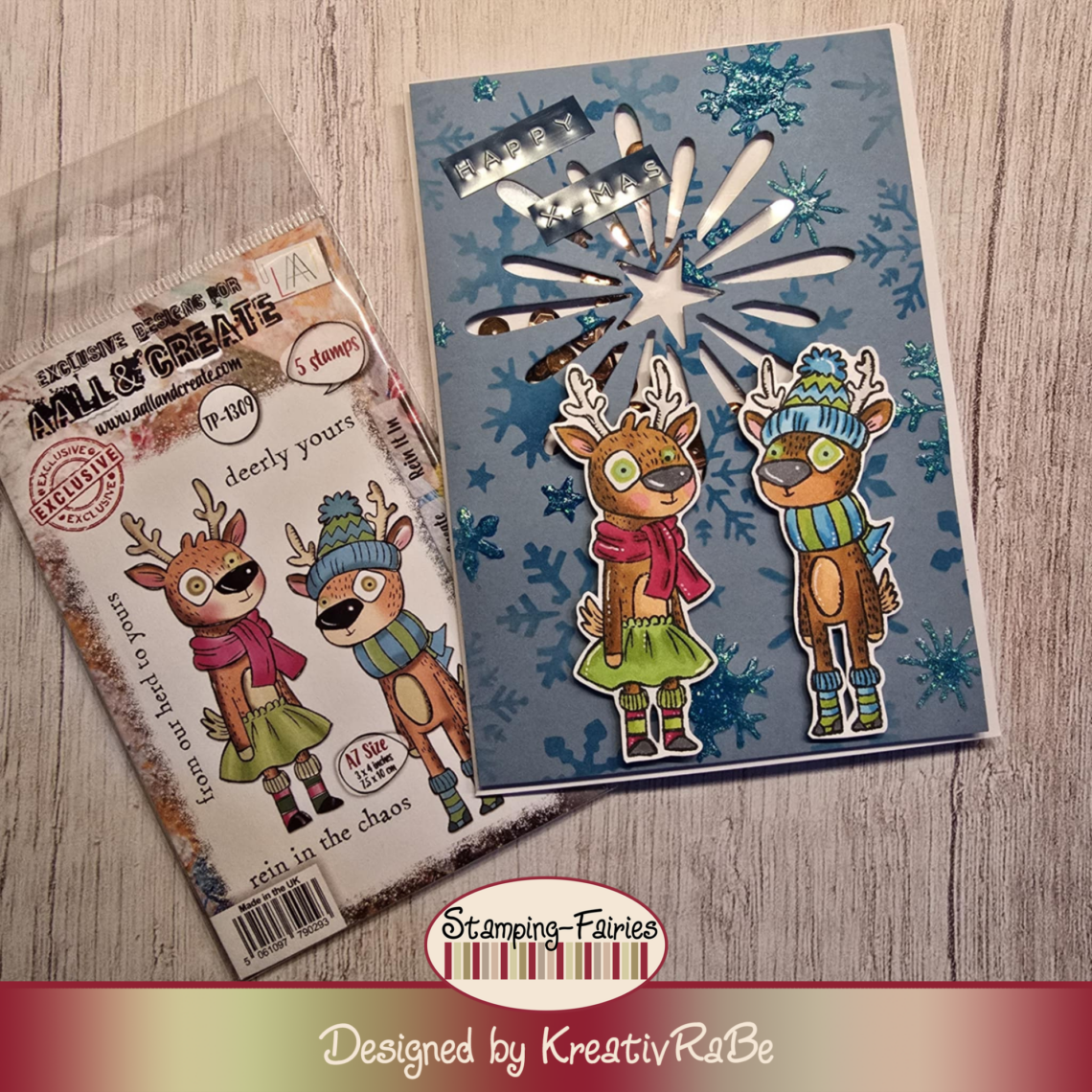 heute habe ich für euch eine weitere Weihnachtskarte. Dieses mal mit einem Schütteleffekt, hinter dem Stern habe ich Gold/Bronze Schimmer Pailletten versteckt. Wenn man die Karte also bewegt, raschelt es hinter dem Stern. Ich habe mir Blauen Cardstock zusammen geschnitten und habe mit einem Dunkleren Blauton Schneeflocken gewischt. Mit einem Stencil von Stamperia. An ein paar Stellen des Auflegers habe ich Nuvo Glitzer Drops benutzt. Und zwar habe ich die Großflächig verteilt das einige Schneeflocken hervorstehen. Meine kleinen Süßen Elche sind von All & Create das Set TP-1309 Rein It In diese habe ich mit Alkoholmarkern coloriert. Nun Zeige ich euch auch meine Karte.