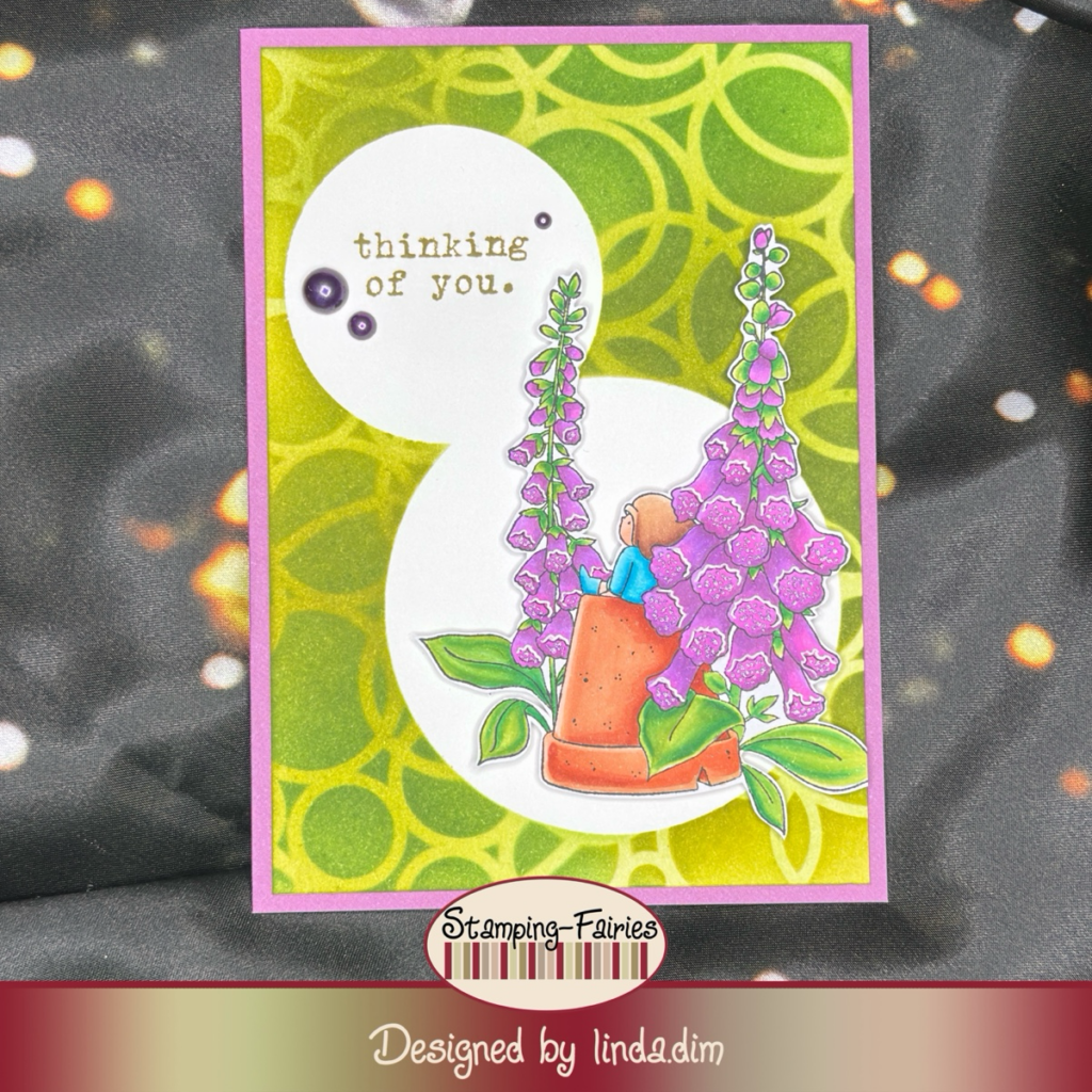 Als erstes stempelte ich mein Motiv aus dem Stempelset Bundle Girl Amongst the Foxgloves von Stamping Bella mit Memento Tuxedo Black Ink auf Markerpapier und kolorierte es mit Copic Markern. Mit einem Glitzerstift und einem weißen Gelstift setzte ich einige Highlights und schnitt das Bildchen per Hand aus.