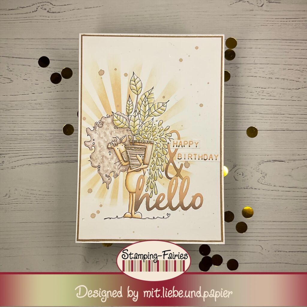 Ich startete direkt mit meinem weißen Kartenaufleger und einem Stencil. Ich schnappte mir ein Beiges Stempelkissen und setzte die „Sonnenstrahlen“ in den Hintergrund. Für meine Verhältnisse ist das seeeehr wenig für einen fertigen Hintergrund. Also musste ich, um mein Gewissen zu beruhigen, wenigstens ein paar braune Spritzer verteilen (weiß wäre ja dieses Mal nicht aufgefallen 😉). Dann nahm ich mir weißen Cardstock und machte mit Pinseln und Stempelkissen einen beige/braunen Farbverlauf. Anschließend Stanzte ich das Wort „hello“ und das Zeichen „&“ aus. Ich mag es immer noch sehr mit Farbverläufen zu spielen, aber komme irgendwie zu selten dazu. Und damit es passt, habe ich die Wörter „happy birthday“ in dem gleichen Farbverlauf auf weißen Cardstock gestempelt und aufgeklebt. Davor durfte natürlich King Lion (und seine Topfblumen 😂) platz nehmen. Dann fehlte nur noch der braune Cardstock rundherum (als Rahmen)..alles zusammengeklebt und fertig! 🤎🤎🤎