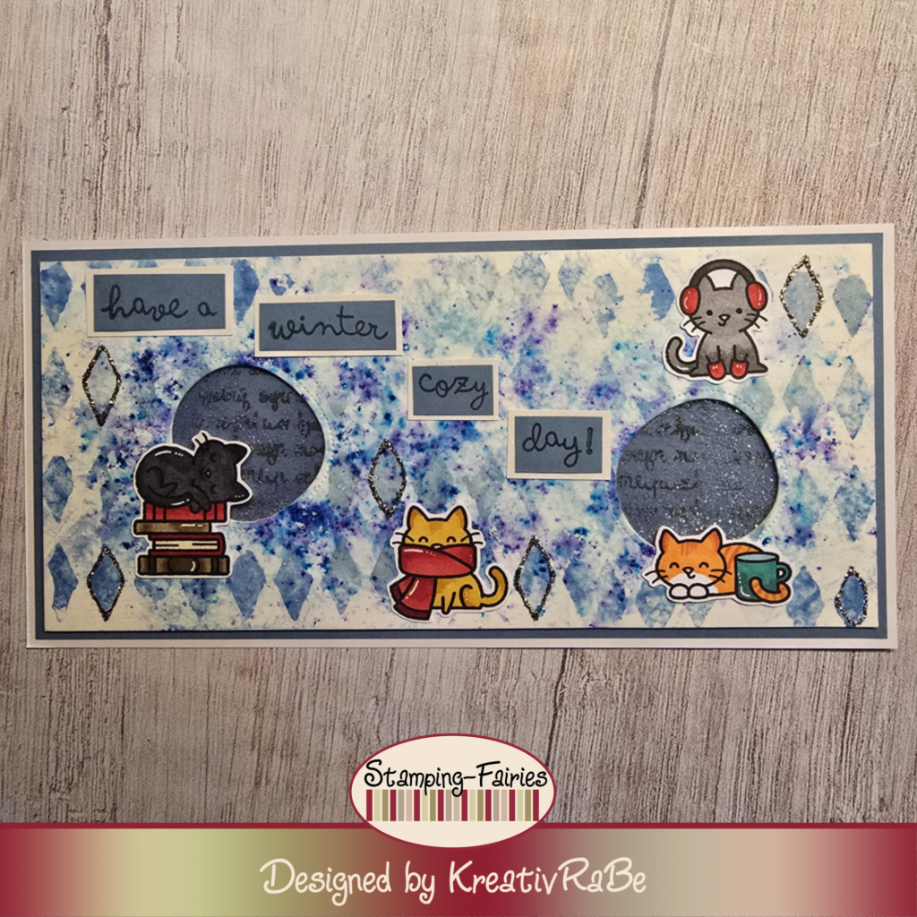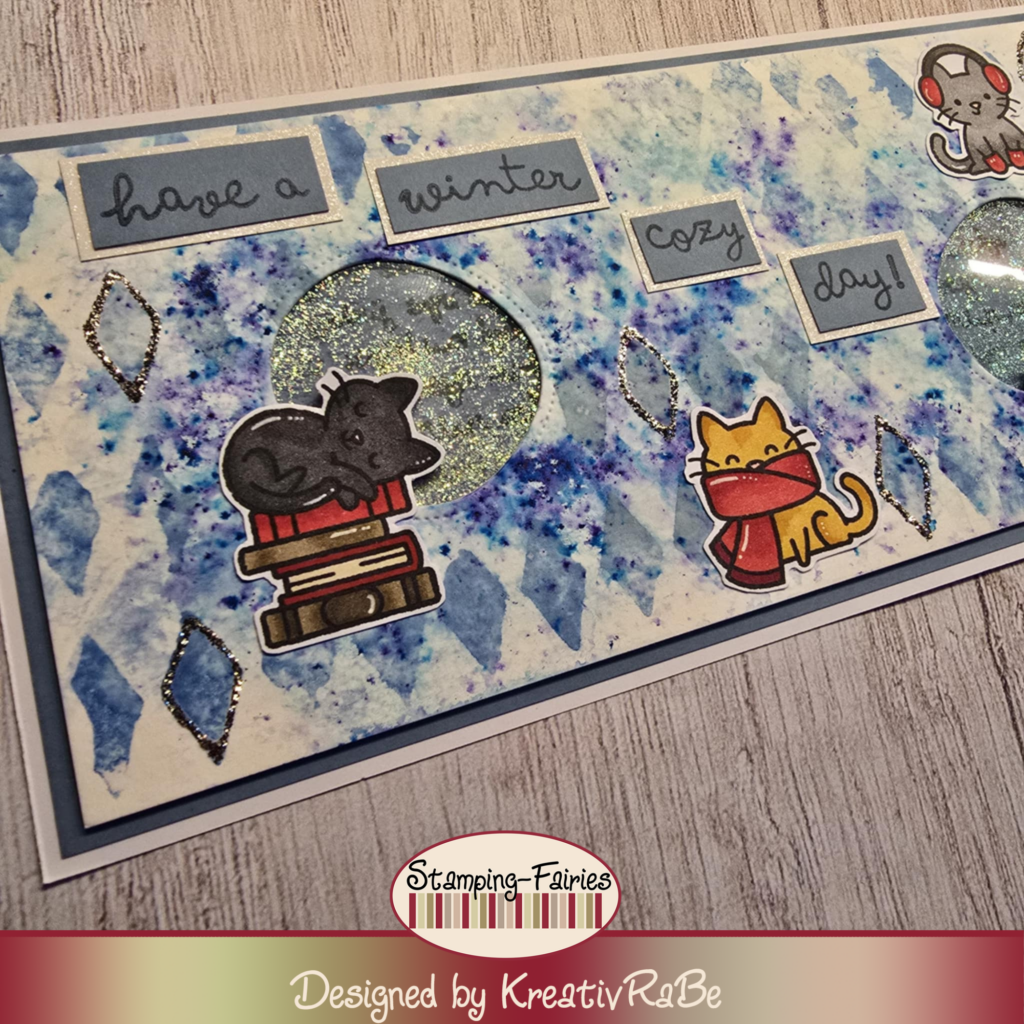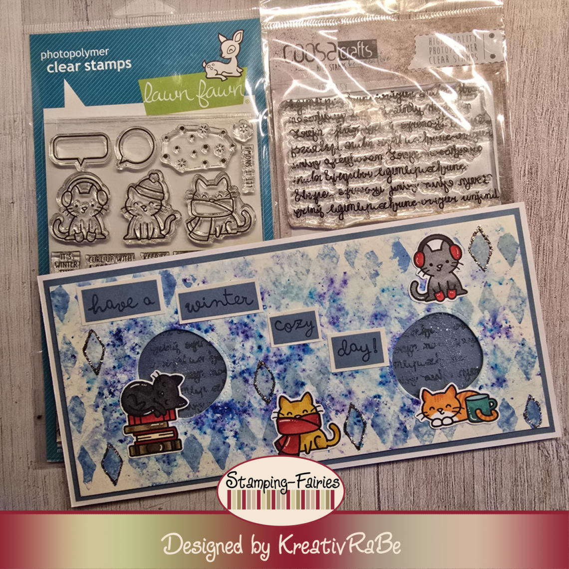 heute habe ich für euch nochmal eine tolle Winterkarte. Die kleinen süßen Katzen musste ich einfach haben. Sie sind aus dem Set von Lawn Fawn und nennen sich Cozy Cats. Den Hintergrund habe ich selbst erstellt mit einem Stencil und mit vielen Blautönen. Dazu habe ich die Oxide Stempelkissen benutzt. Und ich habe mir die guten alten Brushos mal rausgesucht und habe wieder etwas gematscht. Am ende kam dieser tolle Hintergrund raus. Kleine guckfenster sind auch entstanden, dort befindet sich feines Glitzer hinter. Und einen weiteren Stempel habe ich dort auch eingebaut und zwar von Coosacrafts – Fantasy, ich wollte es nicht so Leer dort haben. Etwas Glitzer noch auf den Hintergrund dafür kann man perfekt Stickles oder Nuvodrops für nutzen. Coloriert habe ich das ganze mit meinen Alkoholmarkern. Ich zeige euch nun meine Karte.