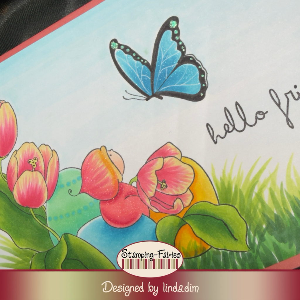 Als erstes stempelte ich mein Motiv aus dem Stempelset Bundle Girl Amongst the Tulips von Stamping Bella mit Memento Tuxedo Black Ink auf Markerpapier und kolorierte es mit Copic Markern. Auch drum herum malte ich mit den Markern eine kleine Szene auf. Mit einem Glitzerstift und einem weißen Gelstift setzte ich einige Highlights.
