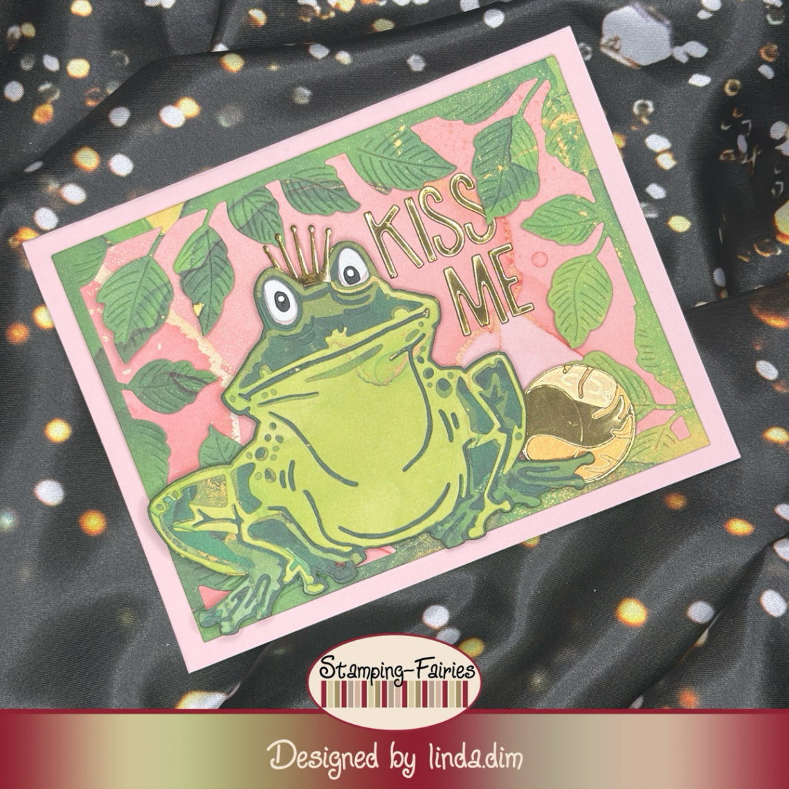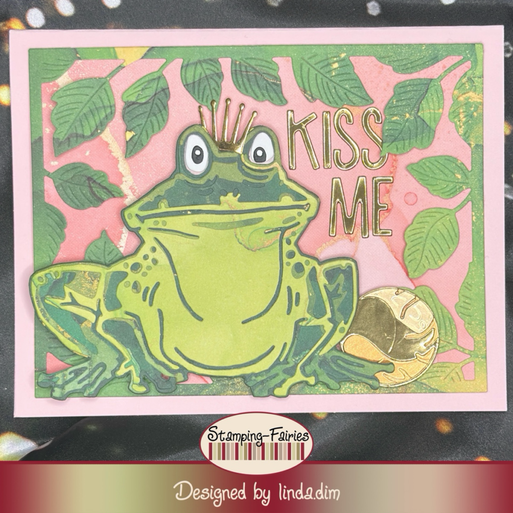 Den Hintergrund der Kartenfront schnitt ich aus einer blassrosa Seite des Ink Drops Festive Papiers, den Blätterrahmen aus einer der grünen Seiten zurecht. Nun konnte alles auf der Kartenbasis befestigt und der Frosch sowie die Goldkugel mit 3D Klebepunkten daraufgesetzt werden.