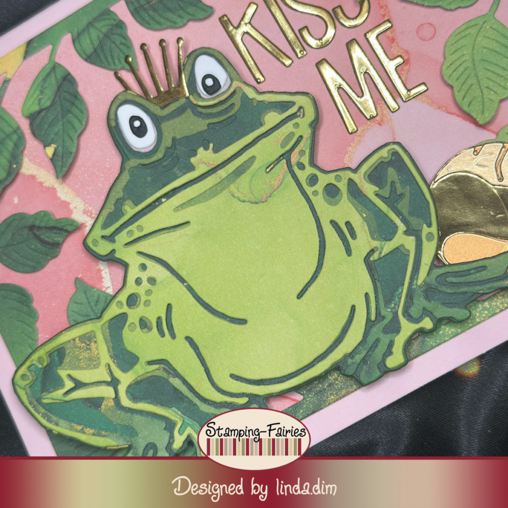 Für meine Froschkönig-Karte stanzte ich zunächst mit der Stanzform Myron von Tim Holtz die benötigten Teile aus diversen grünen Papieren des Craft Consortium Ink Drops Festive Papiers aus und setzte sie entsprechend zusammen. Dabei ließ ich die hellen Schichten am Bauch/Hals weg, da mir das reine Grün besser gefiel. Für die Goldkugel stanzte ich die ersten drei Lagen der Augen-Stanzform des Tim Holtz Sets Trick or Treat aus drei verschiedenen Farbtönen des idea-ology Kraft Metallic Classic Cardstocks aus und setzte sie ebenfalls zusammen. Außerdem stanzte ich die Worte „Kiss Me“ mit den Buchstaben des Sets Santa Greetings ebenfalls aus goldenem idea-ology Kraft Stock Metallic Classic aus.