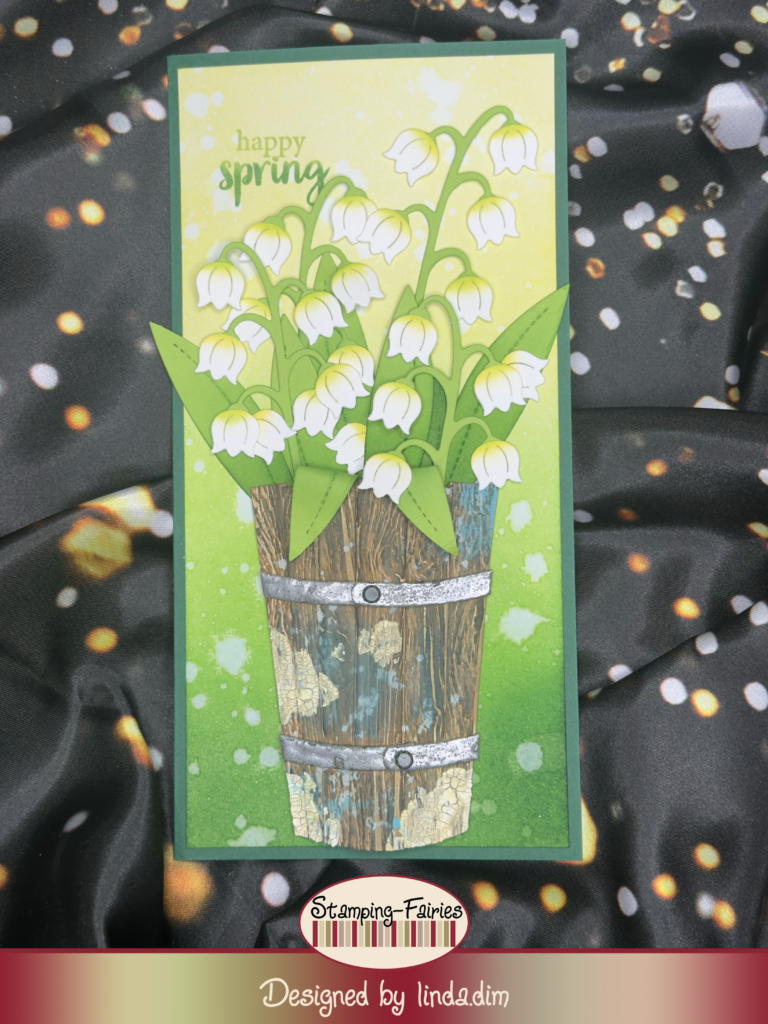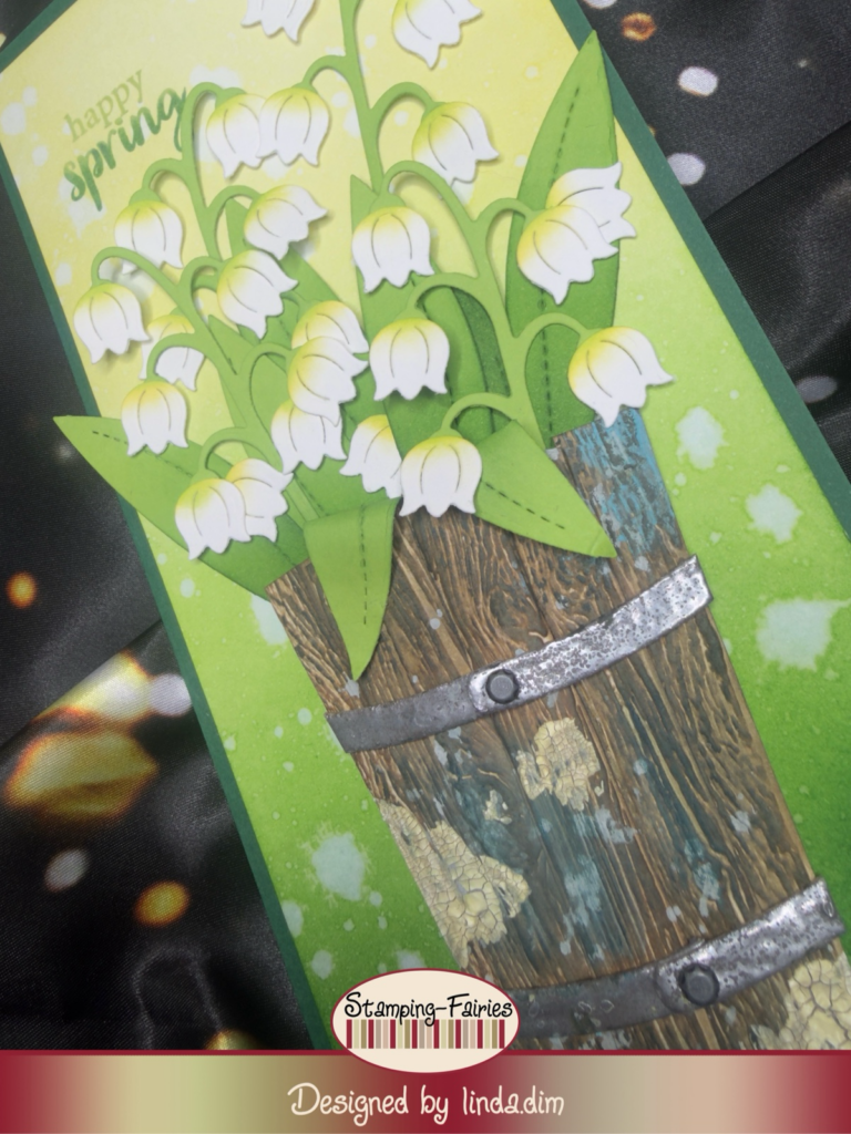Zunächst stanzte ich mit den Stanzformen Lovely Lily of the Valley von Lawn Fawn und Potted 2 von Tim Holtz alle benötigten Teile für die Blütendolden und den Holzeimer aus grünem, weißem und hellbraunem Cardstock aus. Den Eimer stanzte ich doppelt aus. Die obere Lage des Eimers embosste ich mit dem Tim Holtz Embossing Folder Lumber und rieb ein dunkelbraunes Distress Ink Pad darüber, um die Holzstruktur optisch hervorzuheben. Anschließend schnitt ich die obere Lage in Streifen, die ich lamellenartig auf der unteren Lage des Eimers aufklebte. Nun arbeitete ich mit Distress Oxides, Distress Crayons und Distress Texture Paste Crackle opaque, um den Eimer richtig alt und gebraucht aussehen zu lassen. Ich finde, das schafft einen schönen Kontrast zu den zarten, weißen Blüten.
