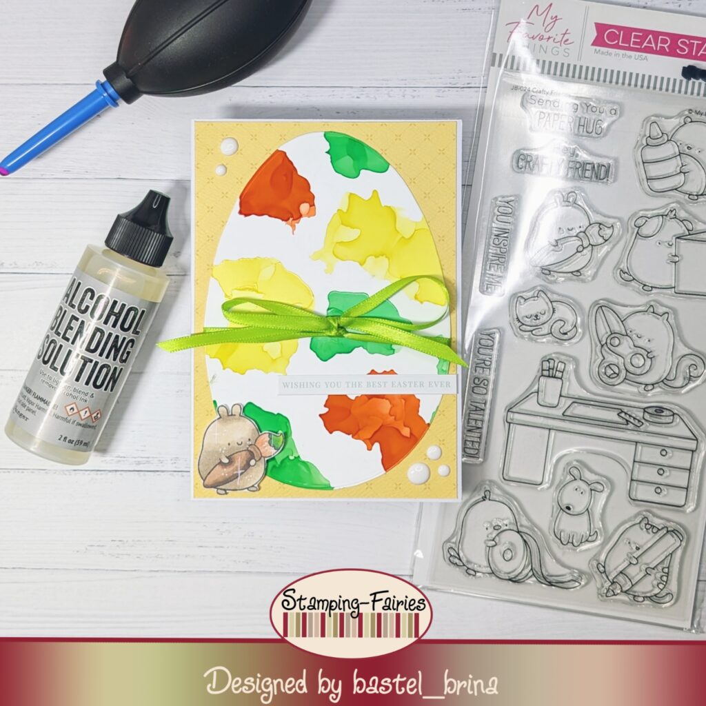 Das große Ei habe ich mit einer Stanze aus weißem Yupo Papier gestanzt – das ließe sich aber bestimmt auch mit einer Schablone oder sogar frei Hand machen, wenn man eine ruhigere Hand hat als ich 😅. Ich habe mir dann drei Farbtöne meiner Alcohol inks ausgesucht. Grün musste und wollte ich dabei haben, habe nämlich die Pinselspitze des Hasen bereits grün coloriert.