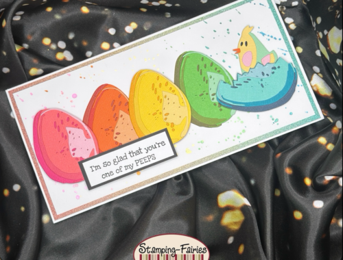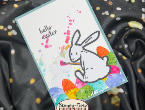 Hallo Ihr Lieben! Heute heiße ich Euch zu meiner letzten Osterkarte – und gleichzeitig auch zu meinem letzten Beitrag für Stamping Fairies – willkommen. Meinem Häschen ist beim Eier bemalen ein kleines Missgeschick passiert, und es hat mit der Farbe…